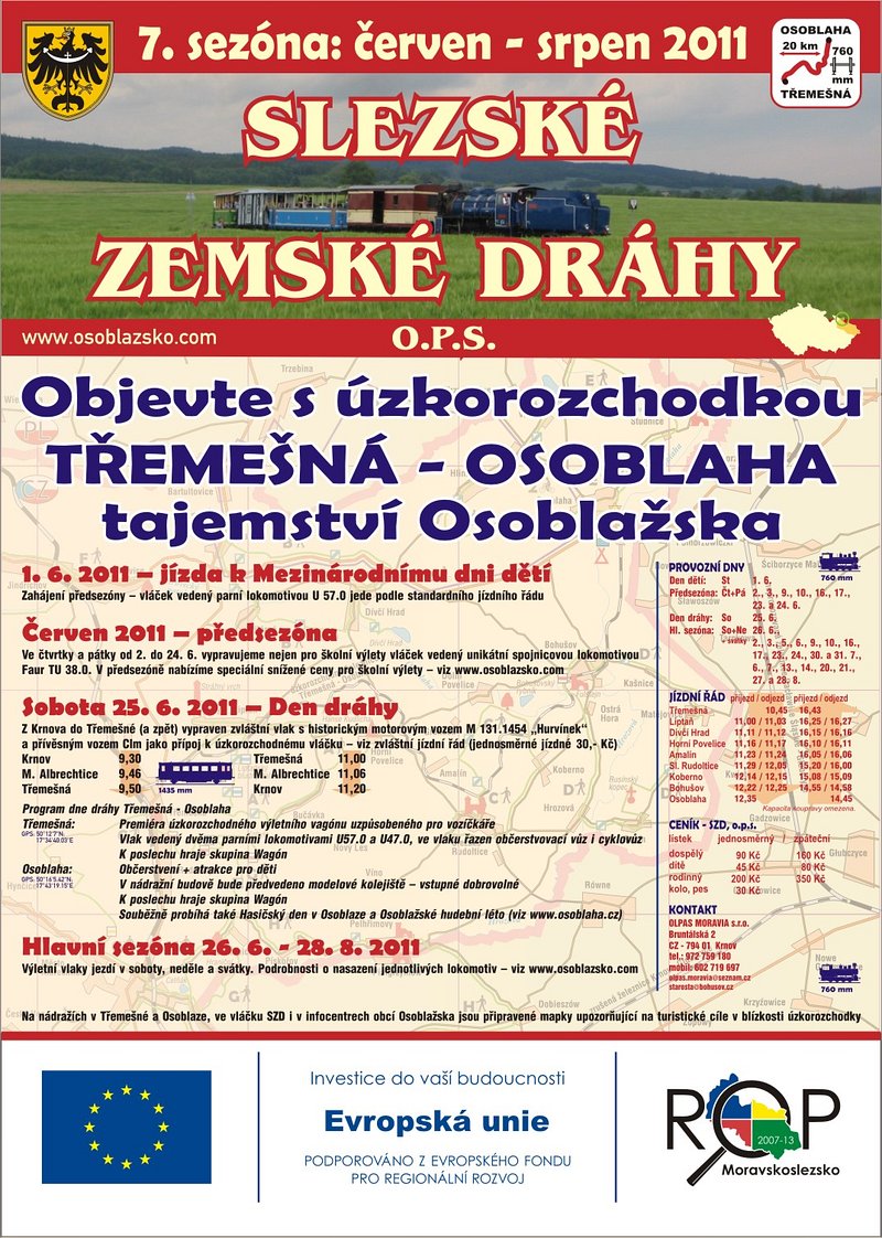 Jízdní řád zvláštních vlaků zůstal stejný, jako v uplynulých letech. Odjezd z Třemešné ve Slezsku v 10:45 a odpolední návrat zpět v 16:43. Sobotní vlaky budou vedeny parní lokomotivou U57.001 a nedělní potom motorovou lokomotivou TU38.001 „Faur”. Do Třemešné jsem se snažil přijet co nejdříve, abych měl dostatek času zachytit přípravu obou parních lokomotiv. Do odjezdu parního vlaku v 10:45 zbývalo ještě dost času, ale stanice se začala brzy plnit návštěvníky. Souprava parního vlaku byla mezitím sestavena a čekala vzadu u výtopny na příjezd pravidelného Os20606 z Osoblahy. Před desátou hodinou jsem přejel do Slezských Rudoltic, abych vyčkal příjezdu pravidelného Os20606. Po jeho odjezdu v 10:08 jsem se vracel zpět přes Horní Povelice a Liptaň do Třemešné. Obloha se mezitím zatáhla a spustil se déšť. Ten vytrval až do příjezdu pravidelného Os20606 v 10:36 z Osoblahy a R1183 v 10:40 z Jeseníku. Déšť stále nepolevoval a vytrvale doprovázel i odjezd parního vlaku Os20651 v 10:45. Vrátil jsem se do stanice, kde byl zvláštní motorový vlak připravený k odjezdu zpět do Krnova v 11:00. Pokračoval jsem dále směrem do Horních Povelic. Zdá se, že déšť je zapomenut a na obloze se ukazuje opět slunce. Pravidelný Os20607 má trochu zpoždění. Parní vlak Os20651 už čeká ve Slezských Rudolticích na předjetí. Je vhodné připomenout, že do roku 2008 byla v Horních Povelicích blíže k budově ještě manipulační kolej, na kterou se mezi výkolejky vešel jeden nákladní vůz. Patrně to byla vůbec nejkratší manipulační kolej v naší železniční síti. Další zastavení mám naplánováno v Bohušově. Nejdříve přijíždí pravidelný Os20607 a za necelých 20 minut také parní vlak Os20651. Do Osoblahy přijíždím v okamžiku, kdy už probíhá posunování s prázdnou soupravou vlaku. Netrvá dlouho a déšť se nás snaží zahnat na nástupiště pod střechu. Až s odjezdem pravidelného Os20608 v 13:50 se počasí trochu umoudří. Po 14. hodině parní lokomotivy U57.001 a U46.002 vyjíždí od depa a posunují se soupravou vlaku zpět na dopravní kolej. Ještě před odjezdem parního vlaku Os20650 v 14:45 přejíždím do Bohušova, abych zachytil příjezd parního vlaku. S časovou rezervou přejíždím dále do Slezských Rudoltic a jdu až do polí před stanici. Z lesa vyjíždí parní vlak a zdolává poslední protisměrné oblouky ve stoupání před stanicí Slezské Rudoltice. Ve stanici parní lokomotivy dobírají vodu a vlak vyčkává na křižování s pravidelným Os20609, který je posílen navíc o jeden vůz. Potom parní vlak posunuje na dopravní kolej a v zápětí v 16:00 odjíždí ze stanice Slezské Rudoltice. Posledním místem, kde očekávám parní vlak Os20650, je palouk naproti kostelu v Třemešné s výhledem na celé údolí a úzkorozchodnou trať až za přejezd s hlavní silnicí č. 57. Po zdolání posledního stoupání příjíždí parní vlak Os20650 do Třemešné ve Slezsku v 16:43. Souprava vlaku byla odklizena, parní lokomotiva U46.002 byla dozbrojena vodou, odpopelena a za využití zbylého provozního tlaku sama posunovala na plošinový vůz, na kterém byla odvezena zpět do Krnova. Další informační zdroje: