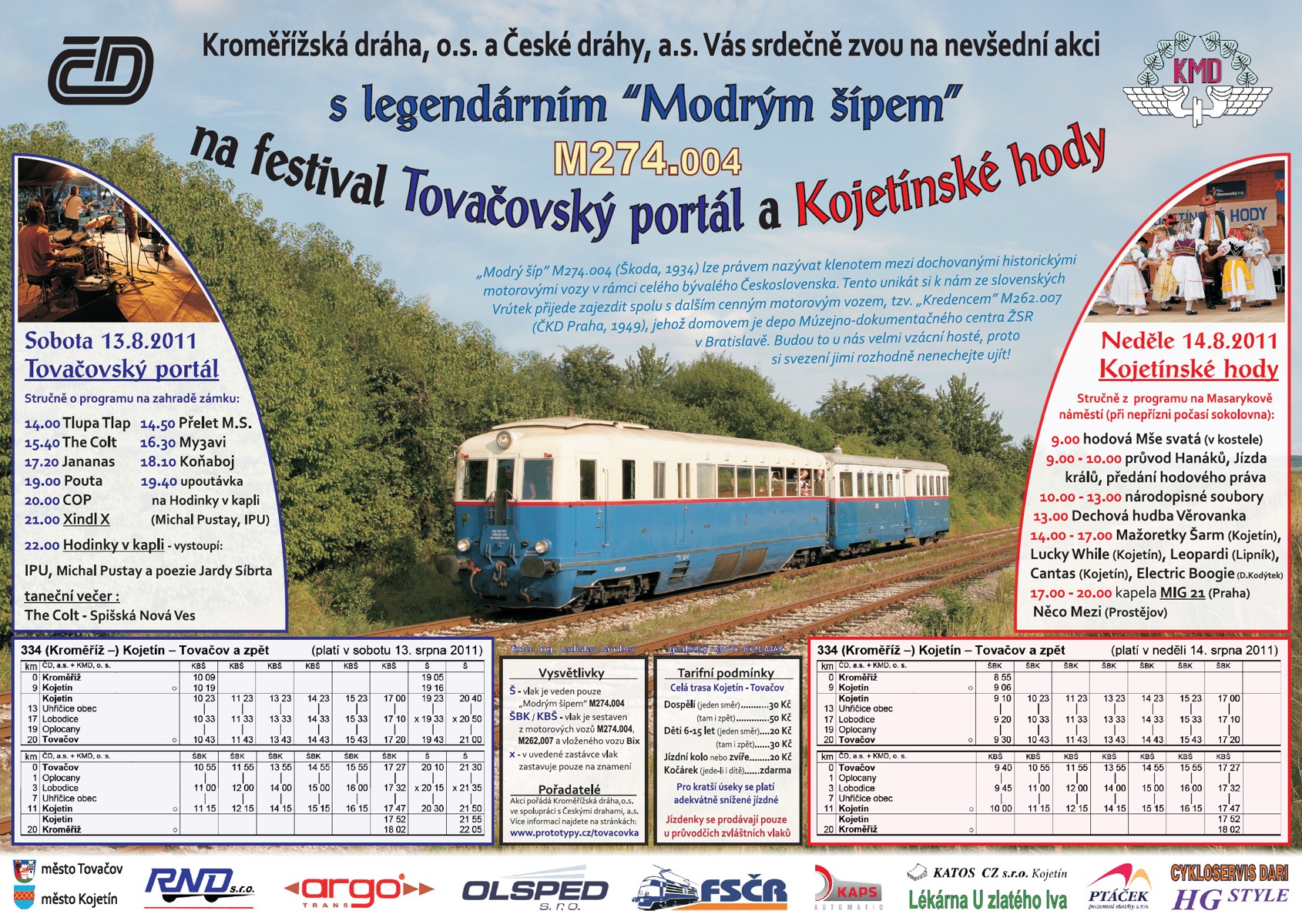 Zvláštní vlaky za letní kulturou   Prázdniny se překulily do své druhé poloviny a školáci pomalu odpočítávají zbývající volné dny. Příznivci trati 334 Kojetín - Tovačov však vědí, že se v polovině srpna konají kulturní akce „Tovačovský portál” a „Kojetínské hody” a v rámci doprovodného programu jezdí po oba víkendové dny zvláštní vlaky mezi Kojetínem a Tovačovem.