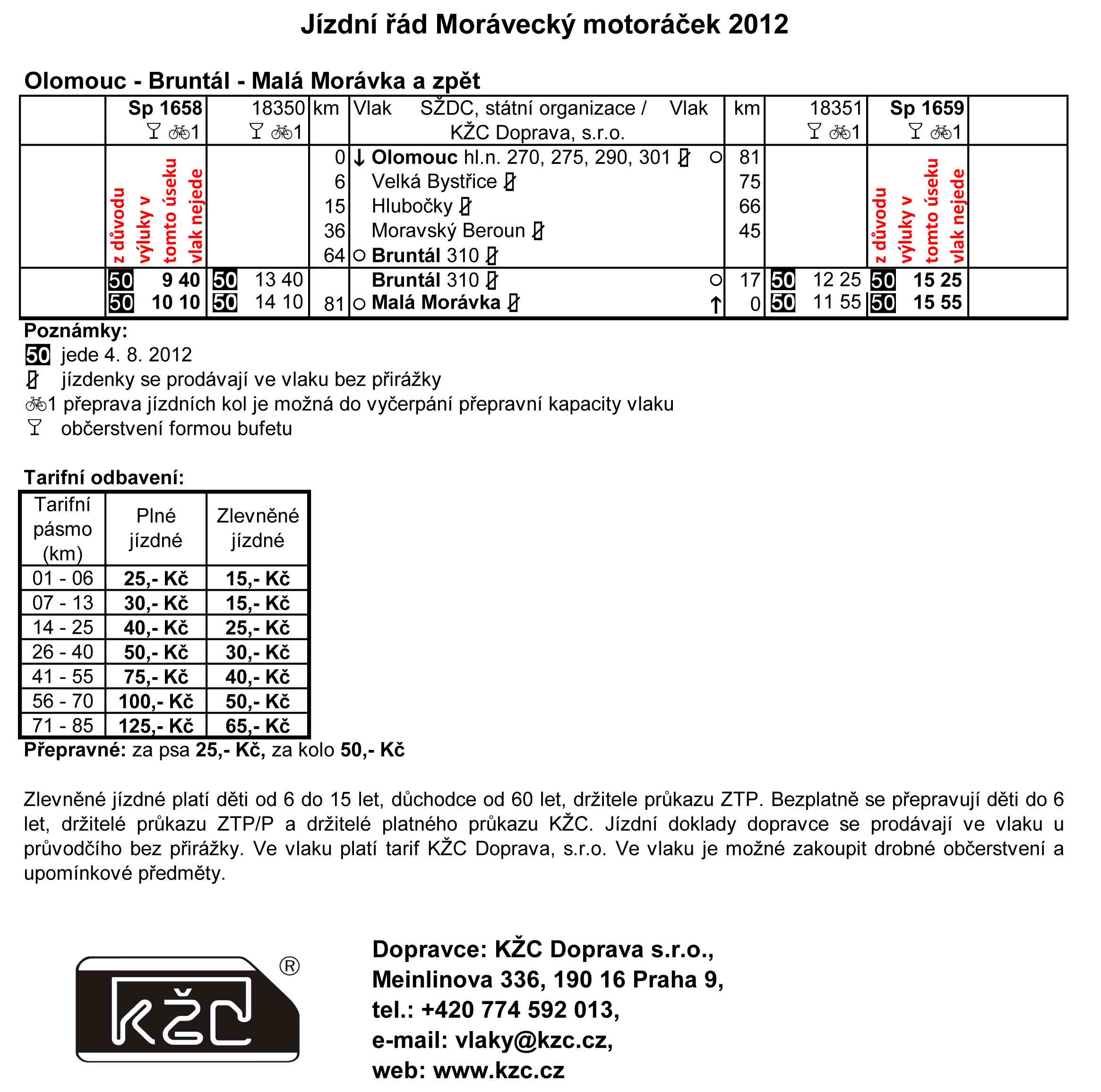Trať 312 spojuje rekreační oblast v okolí Malé Morávky s Bruntálem, odkud je po trati 310 dosažitelný směr do Olomouce a na druhou stranu do Opavy. Na svých 17 kilometrech musí trať zdolat z výchozího bodu Bruntálu ve výšce 555m převýšení 180m do Rudné pod Pradědem zastávky (735m), aby na dalších třech kilometrech sklesala do Malé Morávky do výšky 640m. Největší sklon na trati tak dosahuje 40‰. I když na trati není v současnosti pravidelná osobní doprava, několikrát do roka ve všech ročních obdobích zajíždí do Malé Morávky výletní vlaky nebo fotovlaky příznivců železnice různých soukromých dopravců. Snahou všech těchto subjektů je obnovit na trati do Malé Morávky alespoň sezónní provoz osobních vlaků. Termín jízd Moráveckého Motoráčku společnosti KŽC Doprava, s.r.o. nebyl zvolen náhodně. První srpnový víkend se slaví Den obce Malá Morávka. Program oslav doplňuje i expozice Muzea Kapličkový vrch - Schindlerova stodola. Z důvodu výluky na trati 310 mezi Olomoucí a Bruntálem byly odřeknuty v tomto úseku dva spěšné vlaky Sp1658/1659 a z Bruntálu do Malé Morávky na dvou párech vlaků jezdil motorový vůz 810 399-6. Z celého dne vzniklo pár záběrů dokumentujících jízdy obou párů vlaků, které tak připomněly nedávné období pravidelného provozu. Horské prostředí přineslo během dne několik rychlých zvratů počasí od krásného slunečného až po lehký letní deštík. Další informační zdroje: