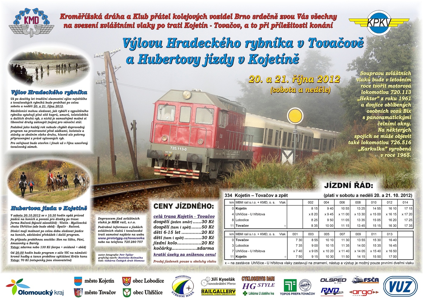 Letos byl tento víkend bohatší na doprovodné akce. Kromě opětovného oživení víkendového provozu na trati Kojetín - Tovačov byl po oba dny pro veřejnost otevřen tovačovský zámek. Kdo využil svezení zvláštním vlakem a zdržel se v Kojetíně, mohl se v sobotu zúčastnit Hubertovy jízdy. Po celý víkend jezdily na trati Kojetín - Tovačov zvláštní vlaky v režii dieselové lokomotivy T435.0113 „Hektor” (720.113-0) a dvou přívěsných vozů Bix. Ve srovnání s minulým rokem byl plánován stejný počet jízd, celkem 7 párů vlaků každý den, ale letošní jízdy začínaly v Tovačově prvním ranním spojen Os 13951 již v 7:30 a končily tamtéž po příjezdu posledního Os 13964 (001) v 17:35. V minulém roce byl jízdní řád koncipován obdobně, ale výchozím bodem jízd byl Kojetín a stejný počet vlaků byl odvezen za kratší dobu. Pro nedělní odpolední jízdy bylo plánováno nasazení lokomotivy T444.1516 „Karkulka”, která má momentálně svůj domov v remíze na vlečce Toposu. Souprava dvouhlavého vlaku měla odvozit poslední dva nedělní páry vlaků Os 13961/2 (011 a 012) a Os 13963/4 (013 a 014). Pro návštěvu Tovačovky jsem měl vyhrazenu sobotu. Předpověď počasí slibovala slunečno pro oba víkendové dny s příjemnými podzimními teplotami, ale také s očekávanými mlhami. Dá se řící, že mlhy k podzimním jízdám na Tovačovce nevyhnutně patří. Scénář počasí byl stejný jako loni. Až kolem jedenácté hodiny se podařilo slunečním paprskům proniknout přes hustou mlhu, které ustupovala jen velmi pomalu. V neděli to bylo dopoledne ještě horší, mlha byl snad ještě hustší a vydržela až do prvních odpoledních hodin. Brzy ráno kolem 7. hodiny již byla souprava vlaku přistavena z vlečky Toposu do Tovačova. Přes hustou mlhu nebyla lokomotiva T435.0113 „Hektor” při objíždění soupravy téměř vidět. Kromě zastávky v Lobodicích stavěly všechny vlaky na znamení na provizorní zastávce Uhřičice - U hřbitova. Tato zastávka však byla obsluhována pouze prvními dveřmi vlaku. Jízdy během celého dopoledne byly doprovázeny mlhou, takže houkání lokomotivy bylo sice s předstihem slyšet, ale vlastní vlak bylo vidět jen na posledních pár desítek metrů. Prvním nasvíceným vlakem byl až Os 13957 (007) po půl dvanácté u bývalé zastávky Oplocany. Po polední pauze pokračovaly odpolední jízdy za příjemných podzimních teplot. Po 16. hodině se začalo slunce rychle přibližovat k horizontu, stíny se povážlivě protáhly. Příjezd posledního vlaku Os 13964 (014) v 17:35 do Tovačova byl doprovázen již posledními slunečními paprsky. Po výstupu cestujících souprava vlaku sunula na vlečku Toposu, kde nocovala před nedělními jízdami. O zdárný průběh celé akce se starali členové občanského sdružení Kroměřížská dráha (KMD). Ve vlacích bylo také možné zakoupit drobné propagační materiály. Vozbu vlaků zajistily po oba dny lokomotivy Klubu přátel kolejových vozidel Brno (KPKV). Lokomotiva T435.0113 „Hektor” byla na akci dovezena v pátek ve večerních hodinách z Mostkovic a po akci byla v neděli večer opět odvezena. Druhá lokomotiva T444.1516 „Karkulka”, které zasáhla do provozu v neděli odpoledne, si odskočila ke svému výkonu z vlečky Toposu. Těmito podzimními jízdami pro letošní rok skončil bohatý provoz zvláštních vlaků na Tovačovce. Další informační zdroje: