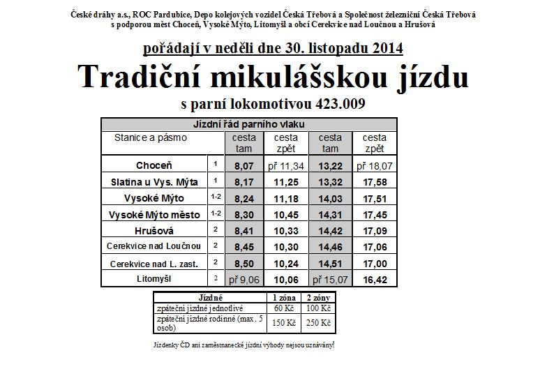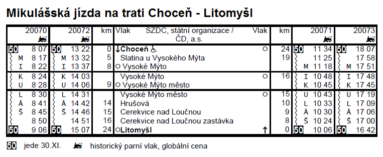 Z časových důvodů jsem se mohl vypravit jen na nedělní Mikulášské jízdy. V posledních letech se zima jen neochotně hlásí o slovo a tak Mikulášské jízdy vypadají kvůli počasí spíše jako podzimní a tu správnou sváteční atmosféru navozuje jen Mikulášská družina. Navíc letos bylo původně avizováno určité zredukování nostalgických jízd, což se mělo projevit i na Mikulášských jízdách z Chocně do Litomyšle vypuštěním jednoho páru vlaků. O to více nás potěšilo, že zůstaly nakonec v jízdním řádu stejně jako v uplynulých letech dva páry parních vlaků. Došlo však k určitým změnám v časové poloze vlaků kvůli potřebě křižování s pravidelnými osobními vlaky. Asi k největší časové změně došlo u odpoledního obratu, kdy byl pobyt v Litomyšli prodloužen zhruba na jeden a půl hodiny a parní vlak Os 20073 byl na zpáteční jízdu z Litomyšle vypravován už za tmy v 16:42. Časně ráno se nám podařilo zdokumentovat příjezd soupravy parního vlaku z České Třebové. Během následující půlhodiny se souprava Mikulášského vlaku zaplnila a první Os 20070 se mohl v 8:07 vydat na trať. Jízdu parního vlaku jsme dokumentovali na známých místech, ovšem letos beze sněhu a slunečních paprsků. Hodinový pobyt ve stanici Litomyšl postačuje na nezbytné objetí soupravy vlaku a provozní údržbu parní lokomotivy. Zbrojení vodou je provedeno z nedalekého hydrantu. Podle jízdního řádu v 10:06 se vydává parní vlak Os 20071 na jízdu zpět do Chocně a my s ním. Větší polední pauzu v Chocni využíváme k návštěvě města. Nevlídné sychravé počasí ven moc netáhne a proto téměř nikoho nepotkáváme. Živěji je na nádraží až před odjezdem odpoledního parního vlaku Os 20072 v 13:22. Pořizujeme záběry z několika dalších míst podél trati a odpolední delší pobyt vlaku ve stanici Litomyšl využíváme jako ostatní na návštěvu města a občerstvení v nádražní „Hospůdce Na konečné”. Poslední záběr jsme pořídili z odjezdu Mikulášského parního vlaku Os 20073 z Litomyšle v 16:42 za svitu už jen nádražních lamp. Další informační zdroje: