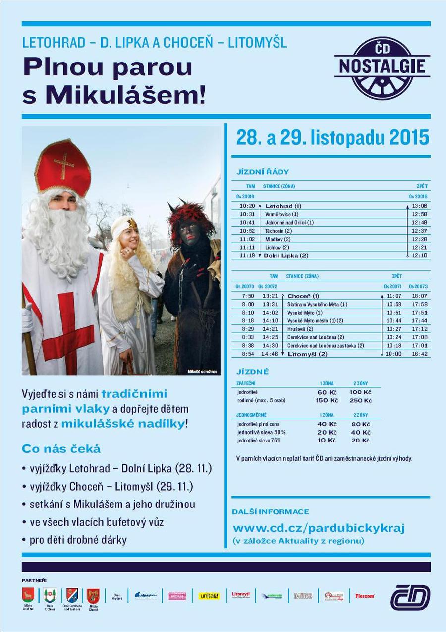 Mikulášská jízda Choceň - Litomyšl   Po malé podzimní přestávce, kdy nebyly na tratích k vidění supící parní lokomotivy, je před námi několik dní, kdy v letošním roce budou ještě jednou roztopeny kotle parních lokomotiv a pára natlakována. Je před námi Mikuláš a s ním Mikulášské jízdy zvláštních parních vlaků konajících se po tři víkendy v různých regionech. Jedny z prvních Mikulášských jízd si odbývá parní lokomotiva 423.009 „Líza” z České Třebové. Již tradičně vyjíždí v jednom víkendu na dvě nedaleké akce. V sobotu si vyjede na již 27. ročník legendárních Mikulášských jízd z Letohradu do Dolní Lipky se soupravou současných vozů s postrkem elektrické lokomotivy (zajišťující zároveň vytápění vozů). V neděli se lokomotiva časně ráno vydá tentokrát s dobovou soupravou vozů typu „Rybák” do Chocně, kde ji čekají dva páry Mikulášských jízd do Litomyšle.