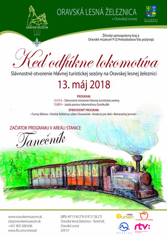 Oravská lesná železnica   Oravská lesná železnica nabízí návštěvníkům svezení v soupravě vyhlídkových vozů tažených dieselovými lokomotivami, v případě menšího počtu cestujících v malé motorové drezíně. V případě vyhlášených tematických akcích vyjíždí na trať v čele vlaků parní lokomotiva „Gontkulák“. Jedna taková tematicky zaměřená akce s názvem „Keď odfúkne lokomotíva“ byla připravená na neděli 13. května při zahájení hlavní turistické sezóně na Oravskej lesnej železnici.