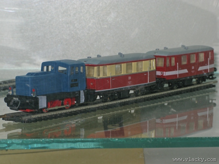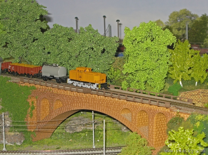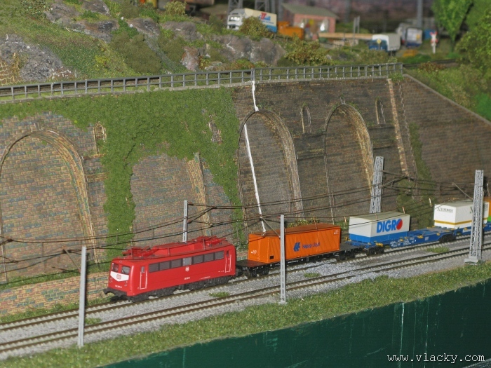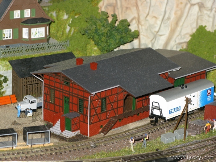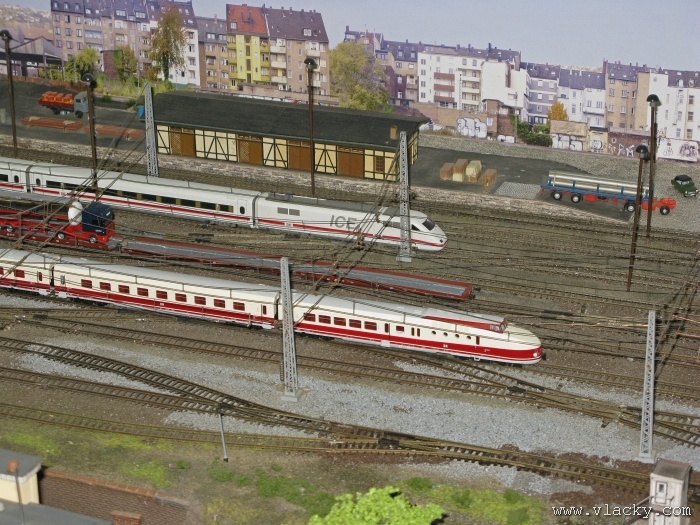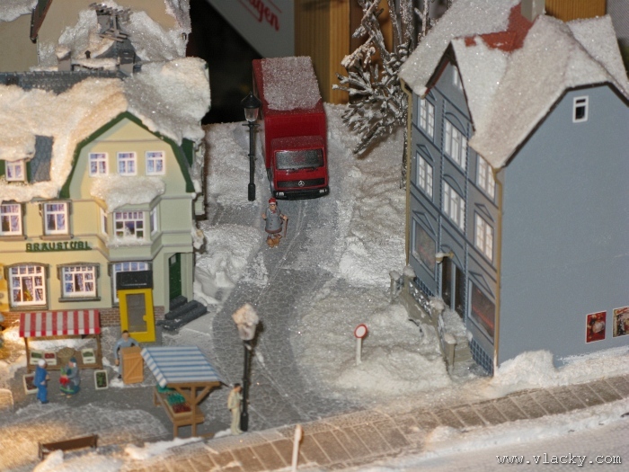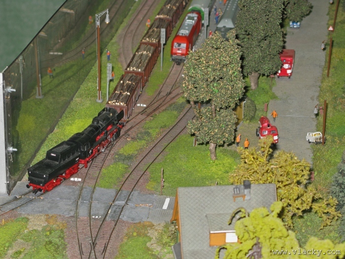 Rychle jsem přešel přes město k tělocvičně ZŠ Komenského, kde se výstava konala. Asi nejvíce času jsem strávil u největšího kolejiště z Německa, samozřejmě v "mé" modelové velikosti TT. Hlavním námětem bylo velké nádraží, které mělo vlevo odstavné a nákladové nádraží a vpravo byla velká hala osobního nádraží. Vzadu se pyšnilo velké lokomotivní depo. Hlavní dvojkolejná trať se klikatila krajinou a mizela v tunelu, kde pokračovala do skrytých nádraží. Po hlavní trati se proháněly dlouhé soupravy vlaků, osobní vlaky a rychlíky zajížděly do haly osobního nádraží, nákladní vlaky projížděly kolem a zastavovaly až v nákladním nádraží, případě jako NEx pokračovaly dále. V popředí tohoto velkého nádraží bylo v náznaku vymodelováno město s výškovými budovami a v přednádraží panoval čilý dopravní ruch. V pravé části kolejiště byla malá stanička na úzkorozchodné trati, po které občas projel výletní parní vlak. V levé části kolejiště mě zaujala lokálka, která zajišťovala dopravní oblužnost menšího městečka. Byl pracovní den, na lokálce vrcholila řepná kampaň a z místní pily byly odváženy vozy Es naložené dřevem. Na tomto kolejišti se mi líbilo dobře zpracované pozadí, které při pohledu na kolejiště dodávalo pocit správné perspektivy. Další část výstavní plochy patřila firmě Auhagen s jejími diorámaty. Bylo možné vidět i zajímavé zpracování zimních motivů se vším, co k zimě patří, např. předvánoční stánkový prodej nebo zasnšžené nádraží s odhrnutými kopami sněhu. Ve vitrinách vystavovala firma Loco zajímavé sety, které byly vyráběny na zakázku a vůbec tak nepřišly do prodejní sítě. Dále zde byla ukázka současné produkce s tolik ohlašovaným novým samovýsypným vozem Facs/Sas. Tento vůz je přepracován z nových forem a vybaven kinematikou. Technickým zpracováním se tak dostává na úroveň továrních modelů Tillig, cenově je však převyšuje. Tyto vozy určené k prodeji budou ve srovnání s tímto vystavovaným vzorkem jednodušší. Budou mít jen základní potisk, zcela bude chybět potisk na rámu, budou bez krycích klapek a nebudou nabarveny kotvy, plošiny a nárazníky. Firma Tillig kromě nezbytného ukázkového kolejiště představila ve vitrinách nejnovější modely. Zmínil bych např. připravovanou elektrickou lokomotivu BR 189 a připravovaný nákladní vůz na uhelný prach. Téměř hotova je elektrická lokomotiva BR 103, která bude vyráběna v kooperaci s firmou Beckmann. K vidění na výstavě toho bylo samozřejmě daleko více. Zmíním třeba kolejiště s námětem divokého západu v modelové velikosti H0, nebo další kolejiště v modelové velikosti TT s námětem provozu na českých tratích. Kolem byly další vitríny s produkcí méně známých malosériových výrobců. Nesmím ani opomenou velké klubové kolejiště KŽM Trutnov, které vídávám pravidelně na modelářských výstavách. Právě na tomto kolejišti měly svou premiéru nové modely samovýsypných vozů Facs/Sas od firmy Loco. V ostrých obloucích na dvojkolejné trati působila ucelená souprava těchto vozů velmi dobře. To vše bude ke shlédnutí ve videoklipu. Další informační zdroje:
