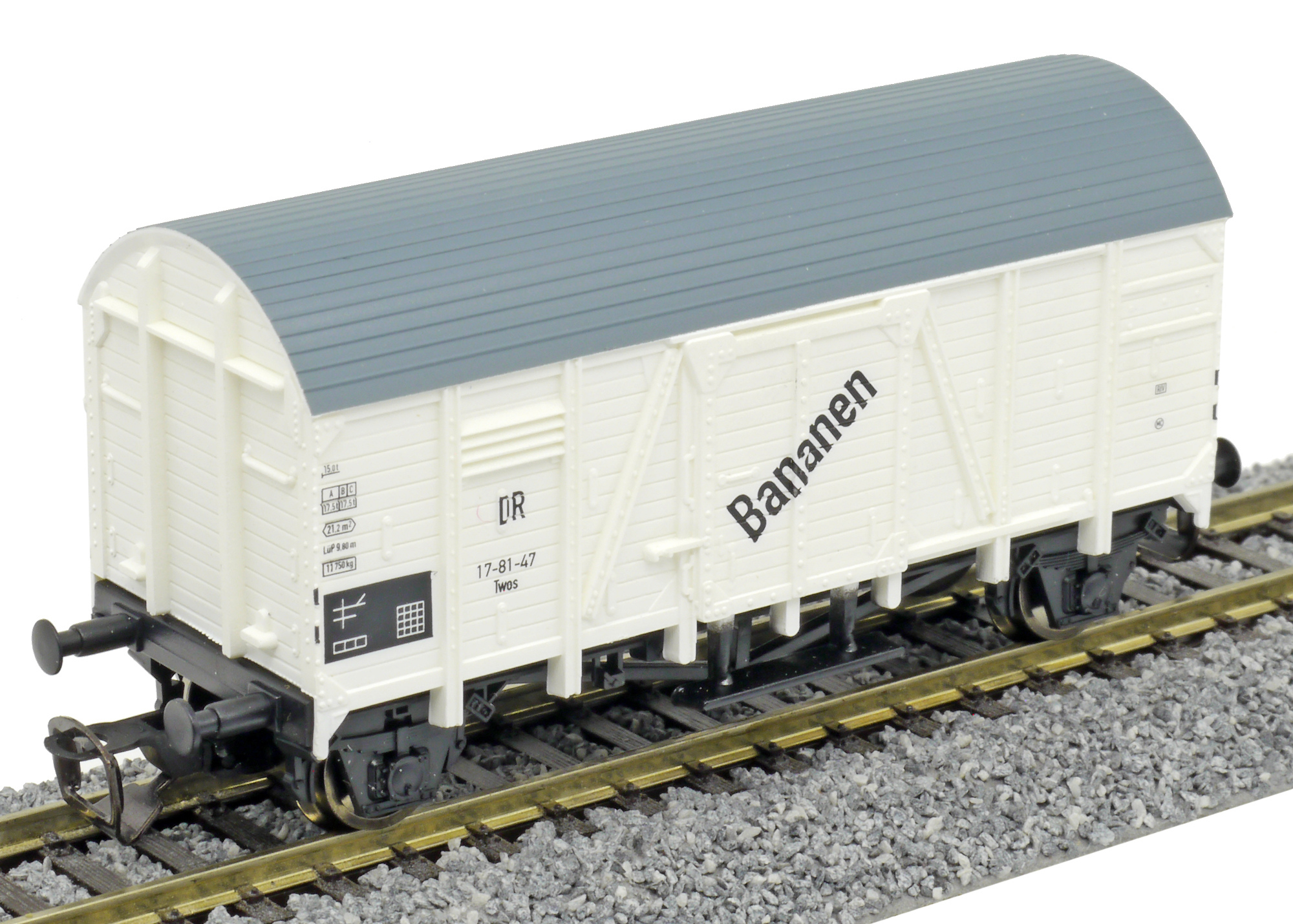 | nákladní vůz bílý s tmavě s šedou střechou „Bananen“ |
