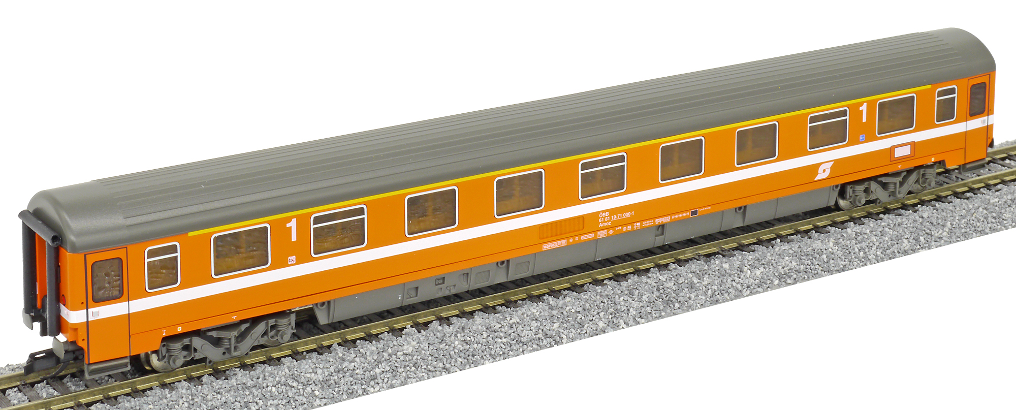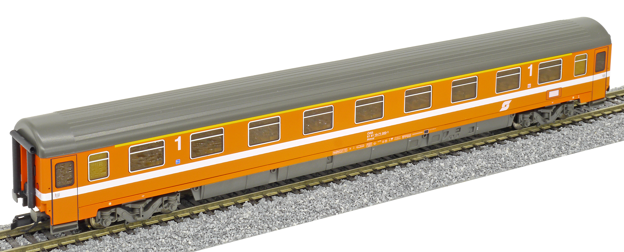 rychlíkový vůz oranžovo-červený s šedou střechou 1. tř.