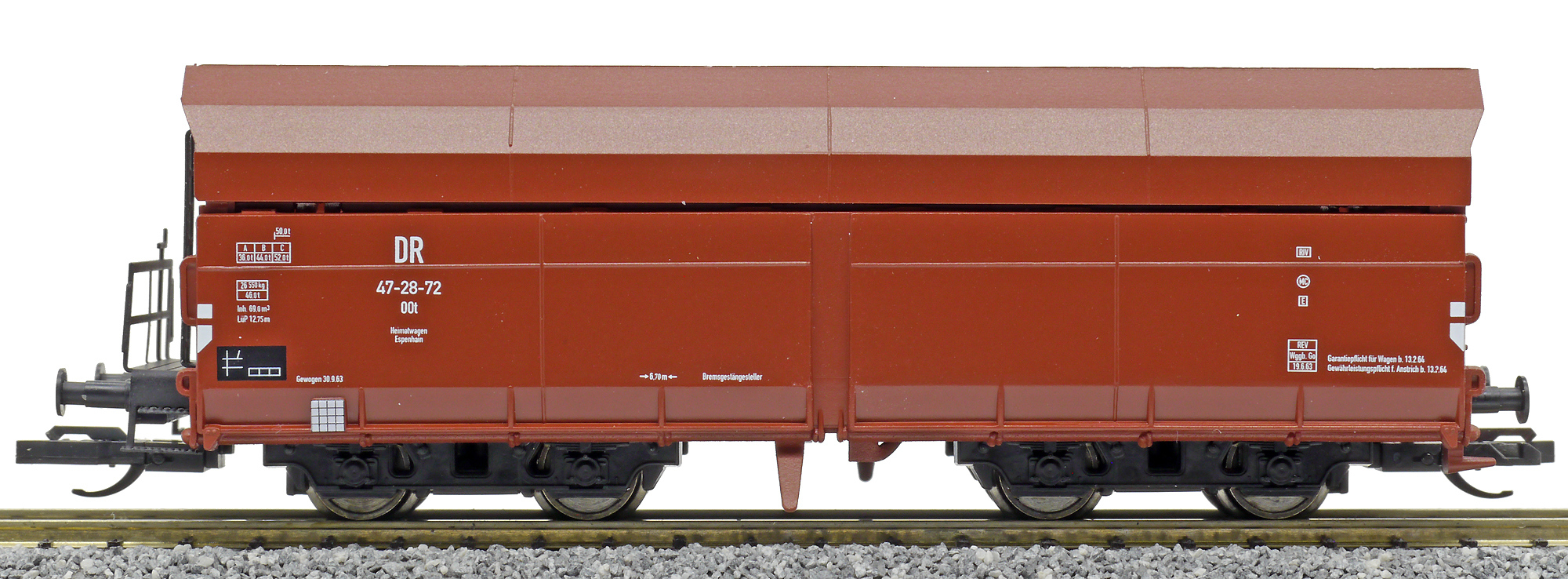 měřítko 1:120 - rozchod kolejí 12 mm kinematika krátkého spřáhla (KKK) podle normy NEM 358 108 mm - celková délka modelu přes nárazníky 4 - celkový počet náprav nebo rozložení náprav 120 g - hmotnost brutto - model včetně prodejního obalu