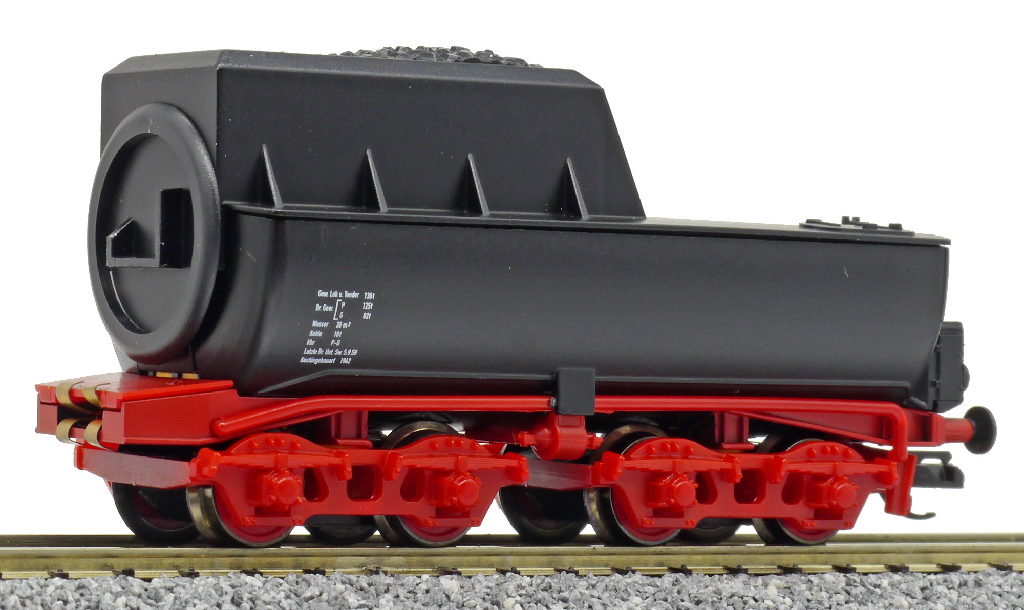 Popis   parní lokomotiva černá s červeným pojezdem a kouřovými plechy