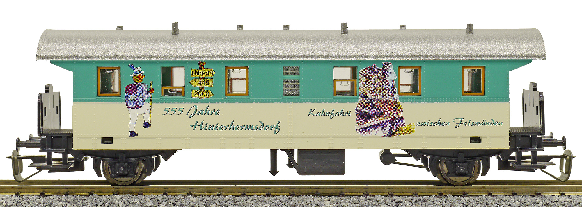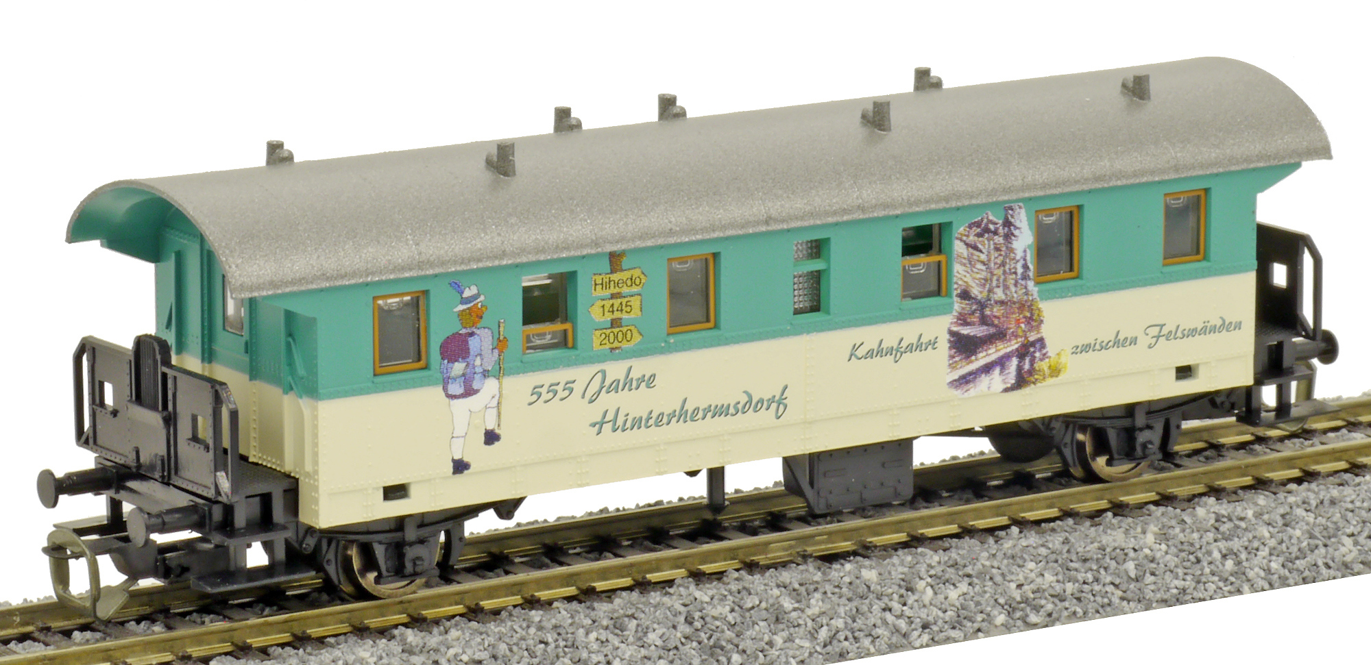 Popis   osobní vůz zelený-slonová kost s šedou střechou „National Sachsische Schweiz“