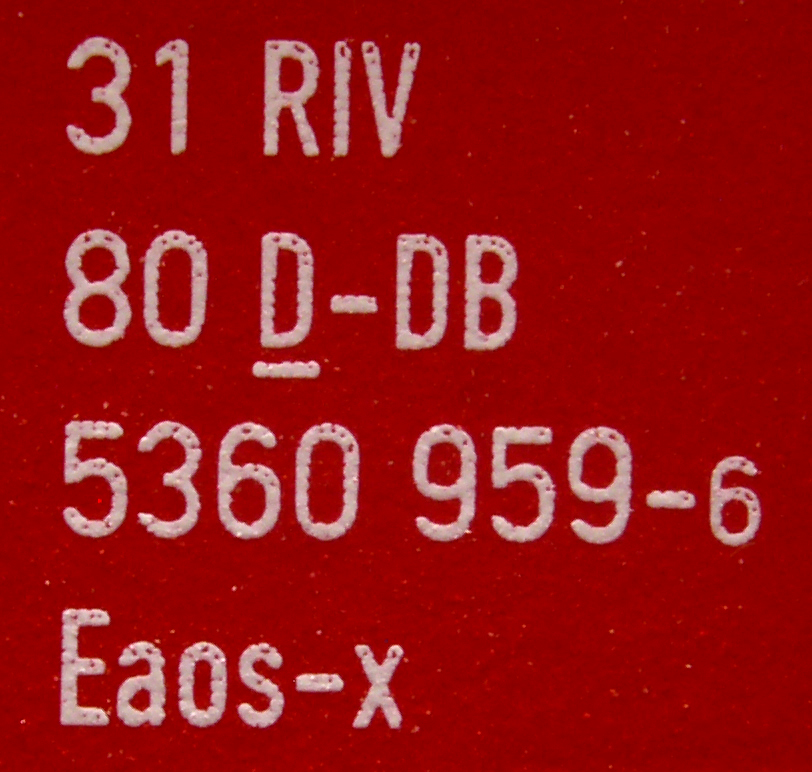 | • 31 80 5360 959-6 | → | nákladní, s podvozky, pevný rozchod, ve vlastnictví železniční správy, RIV, PPV |