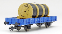 | nízkostěnný nákladní vůz modrý s nákladem tří bubnů kabelů „Elektrizace železnic“ |