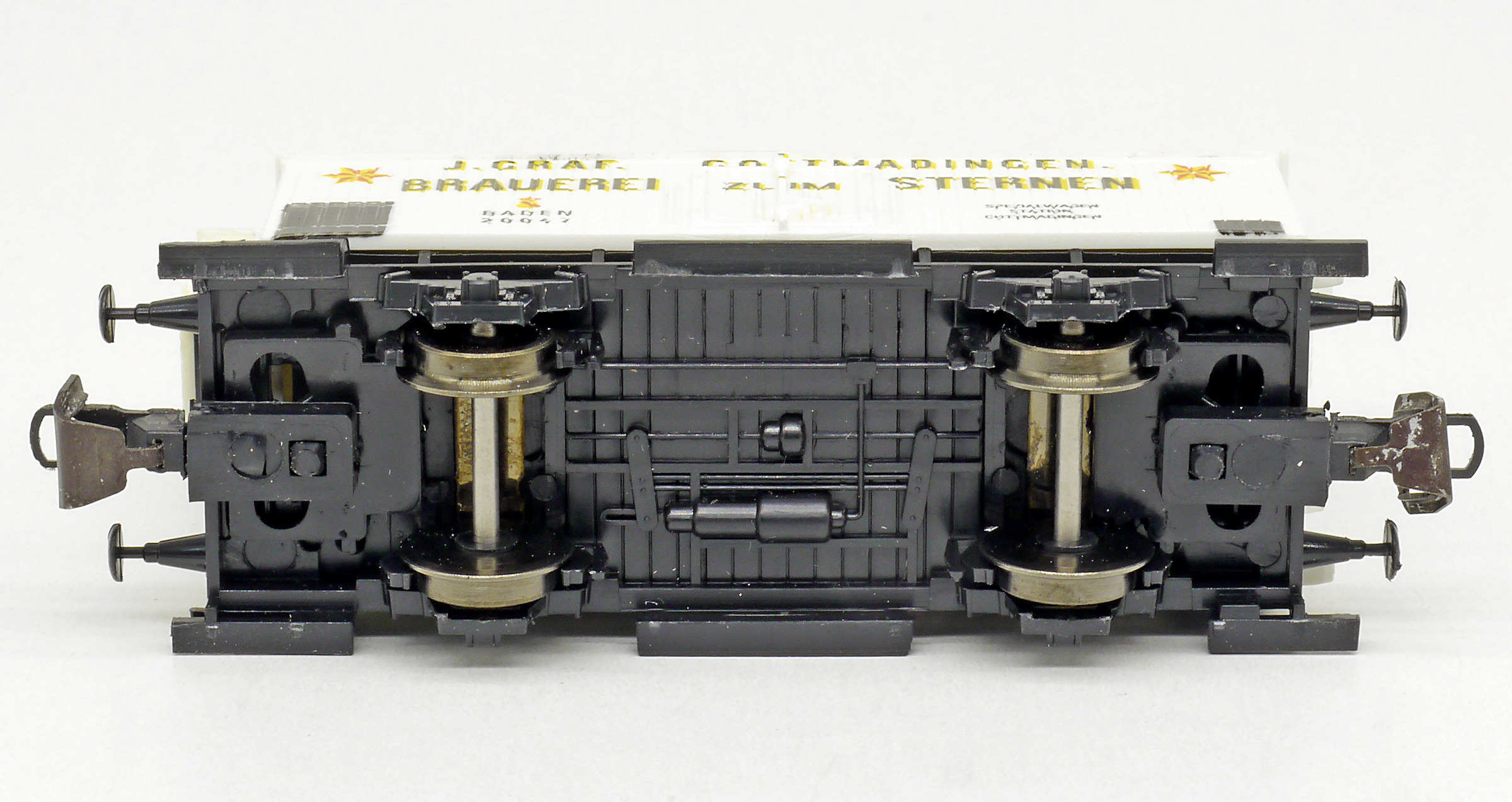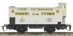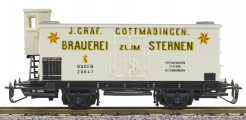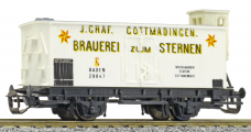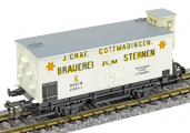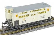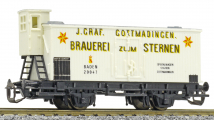 | nákladní chladící vůz bílý s šedou střechou a brzdařskou budkou „Brauerei zum Sternen“ |