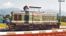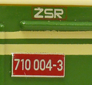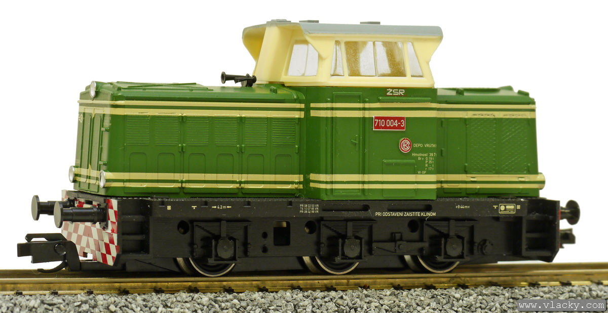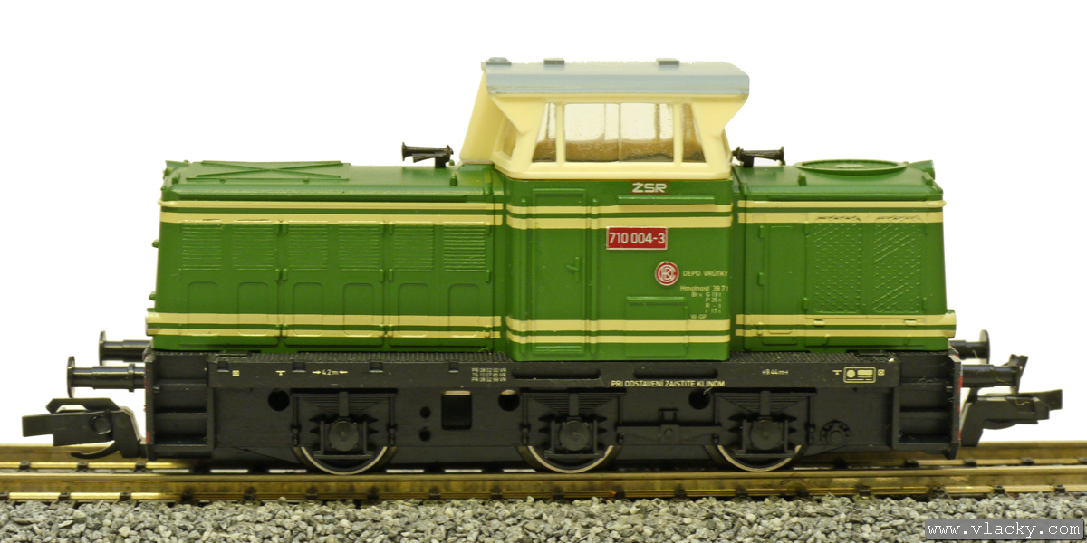 dieselová lokomotiva zelený s bílými proužky, černý rám a pojezd