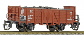| otevřený nákladní vůz červenohnědý s brzdařskou budkou a nákladem uhlí |