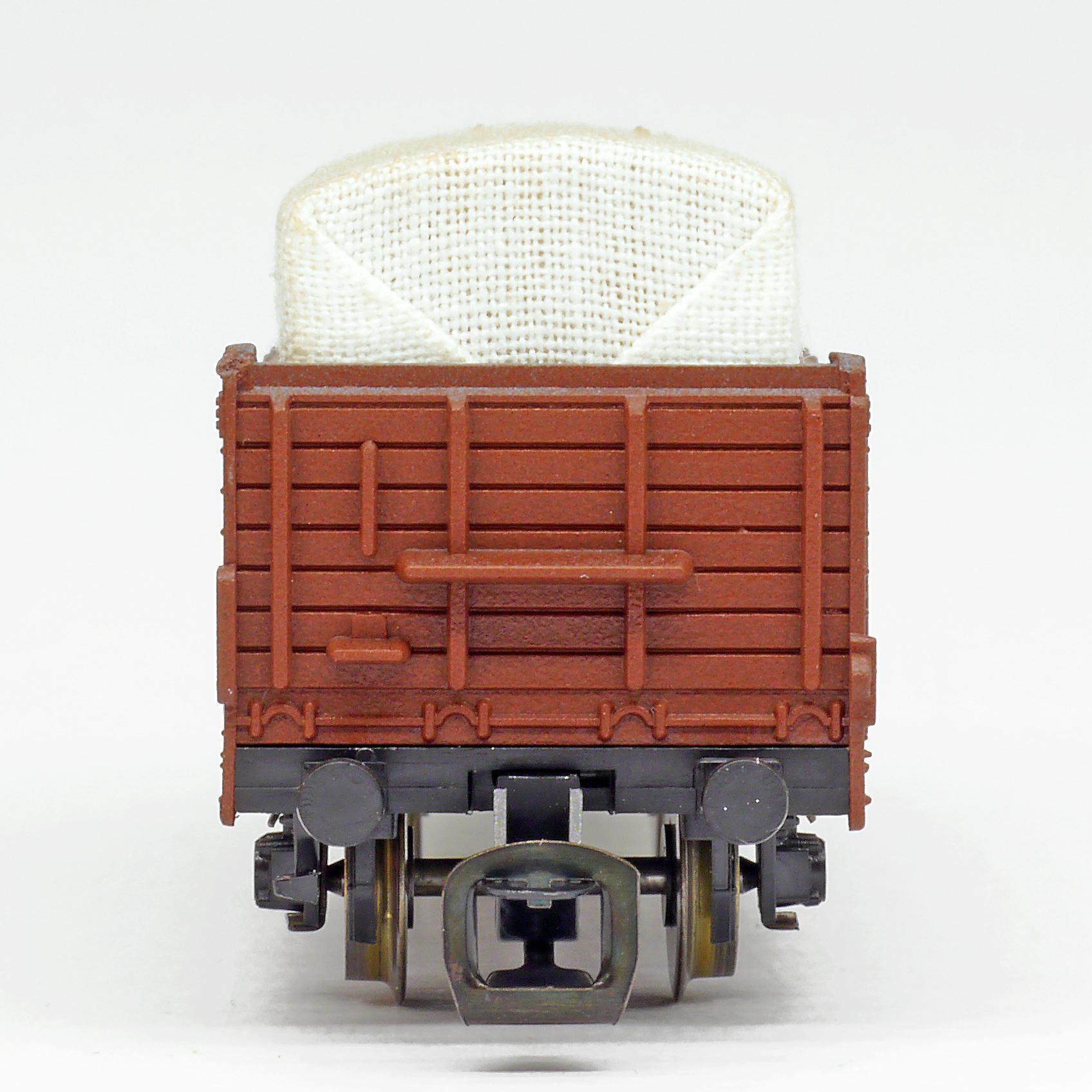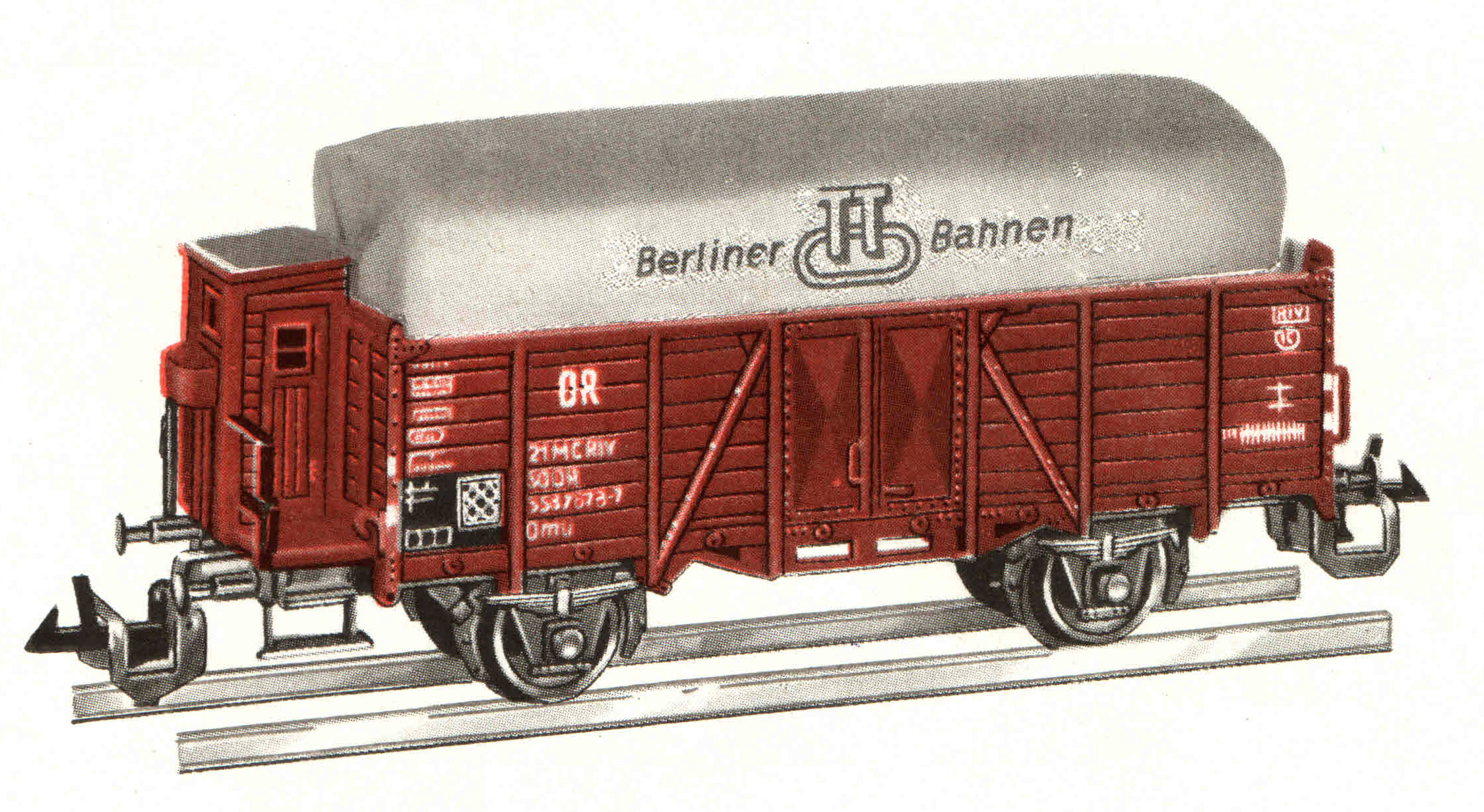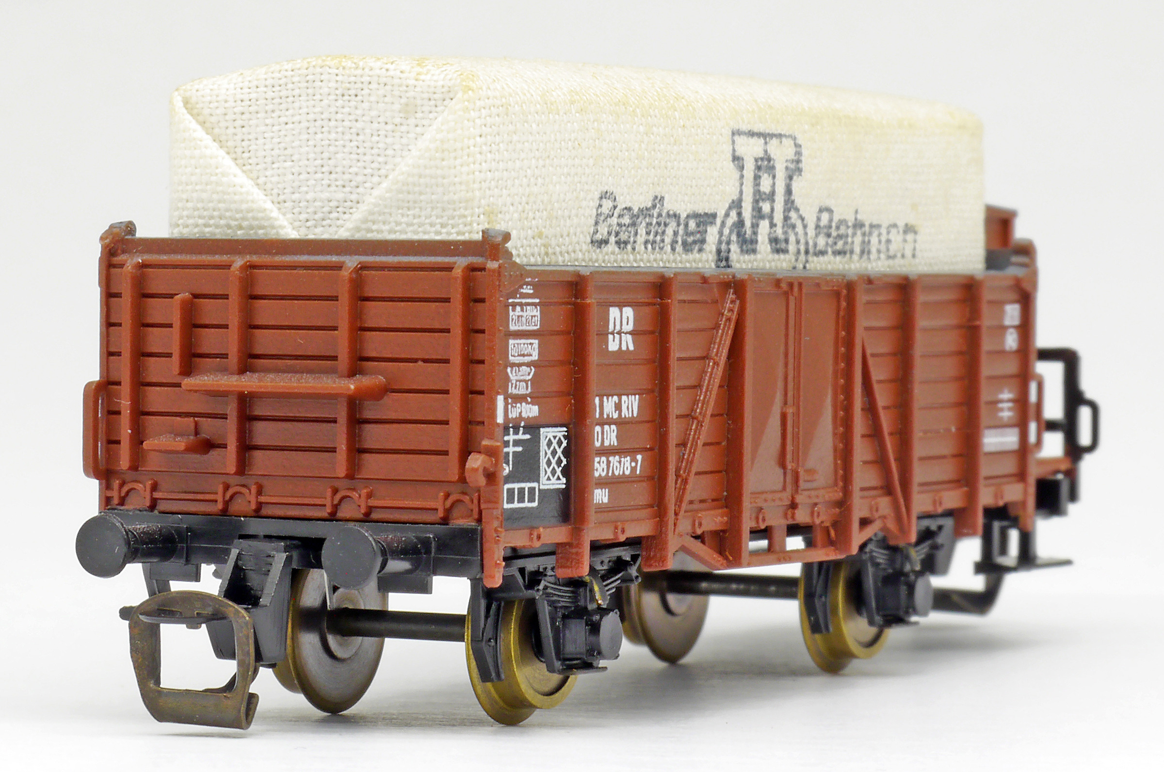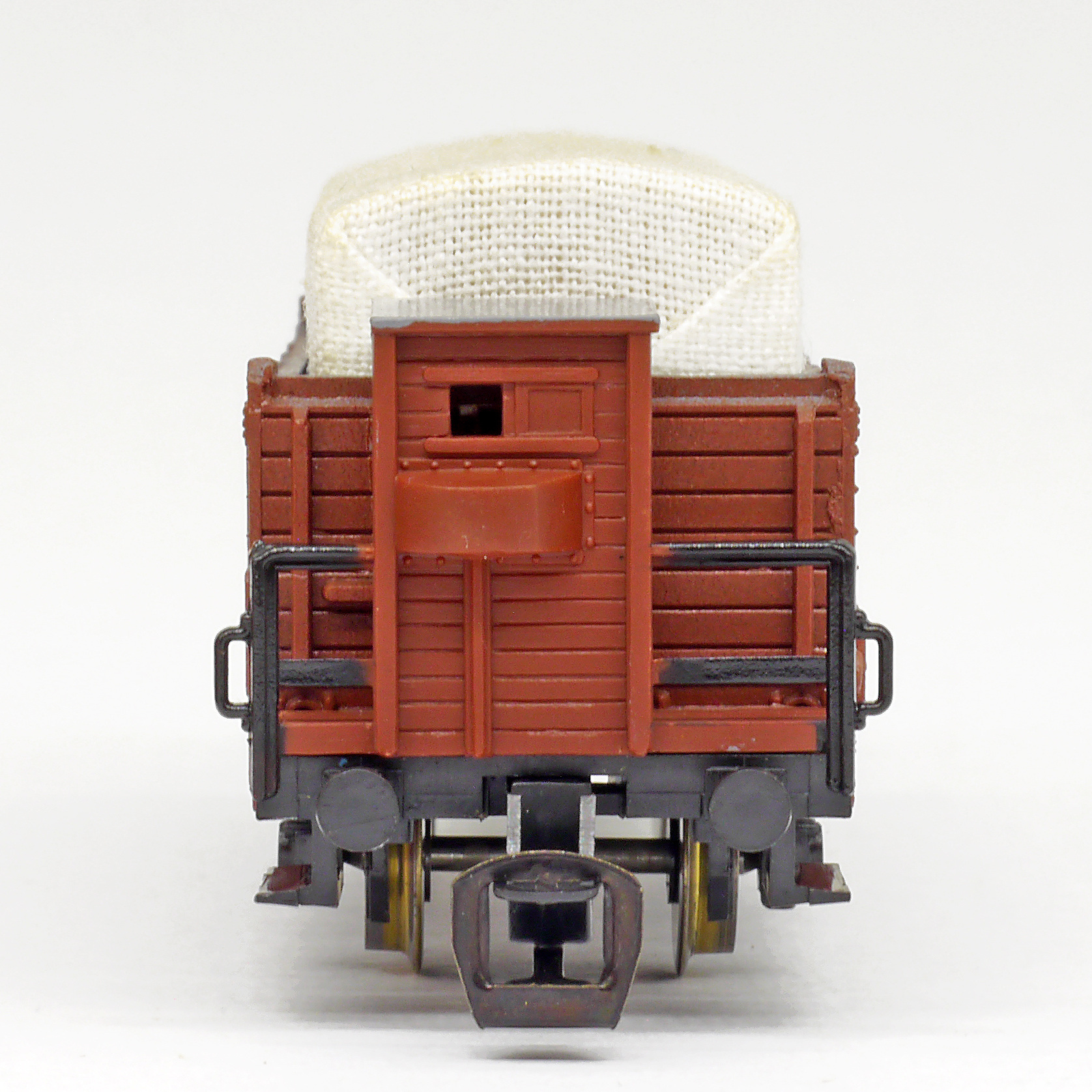 | otevřený nákladní vůz červenohnědý s brzdařskou budkou a plachtou |