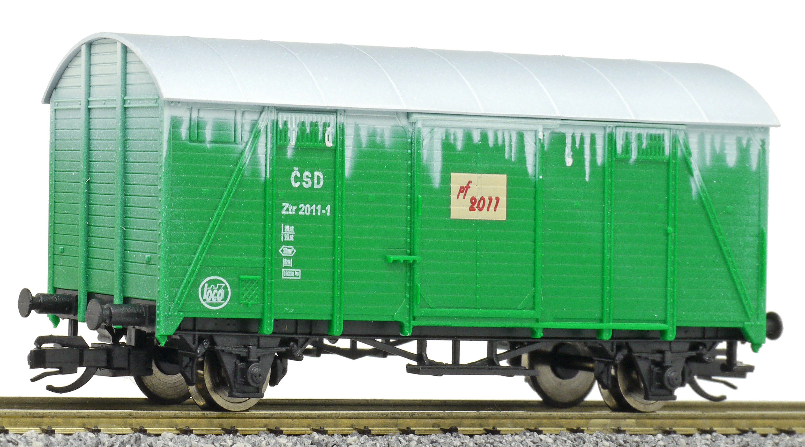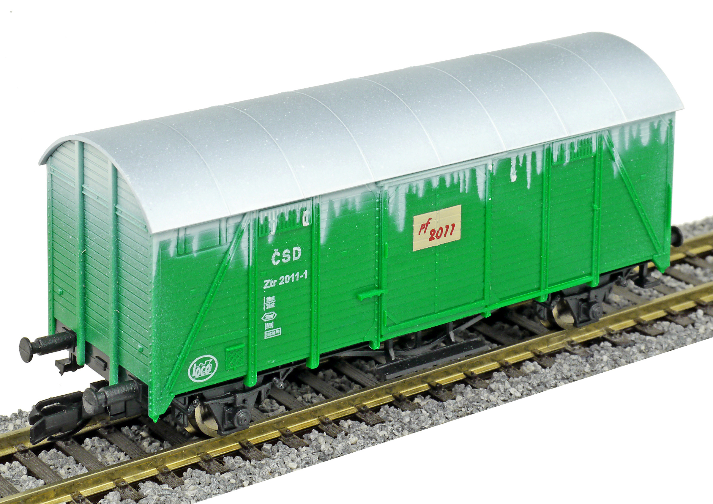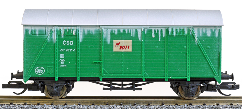 Popis   krytý nákladní vůz zelený s šedou střechou a s cedulí „pf 2011“