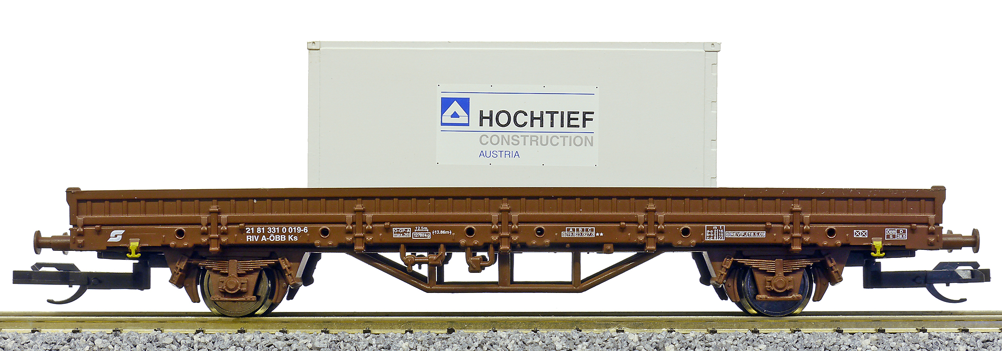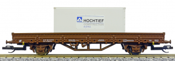 | nízkostěnný nákladní vůz červenohnědý s nákladem kontejneru „HOCHTIEF“ |