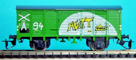 krytý nákladní vůz zelený s šedou střechou a graffiti
