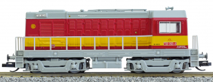 | dieselová lokomotiva červená s šedou střechou, rámem a pojezdem, žlutý výstražný pás |