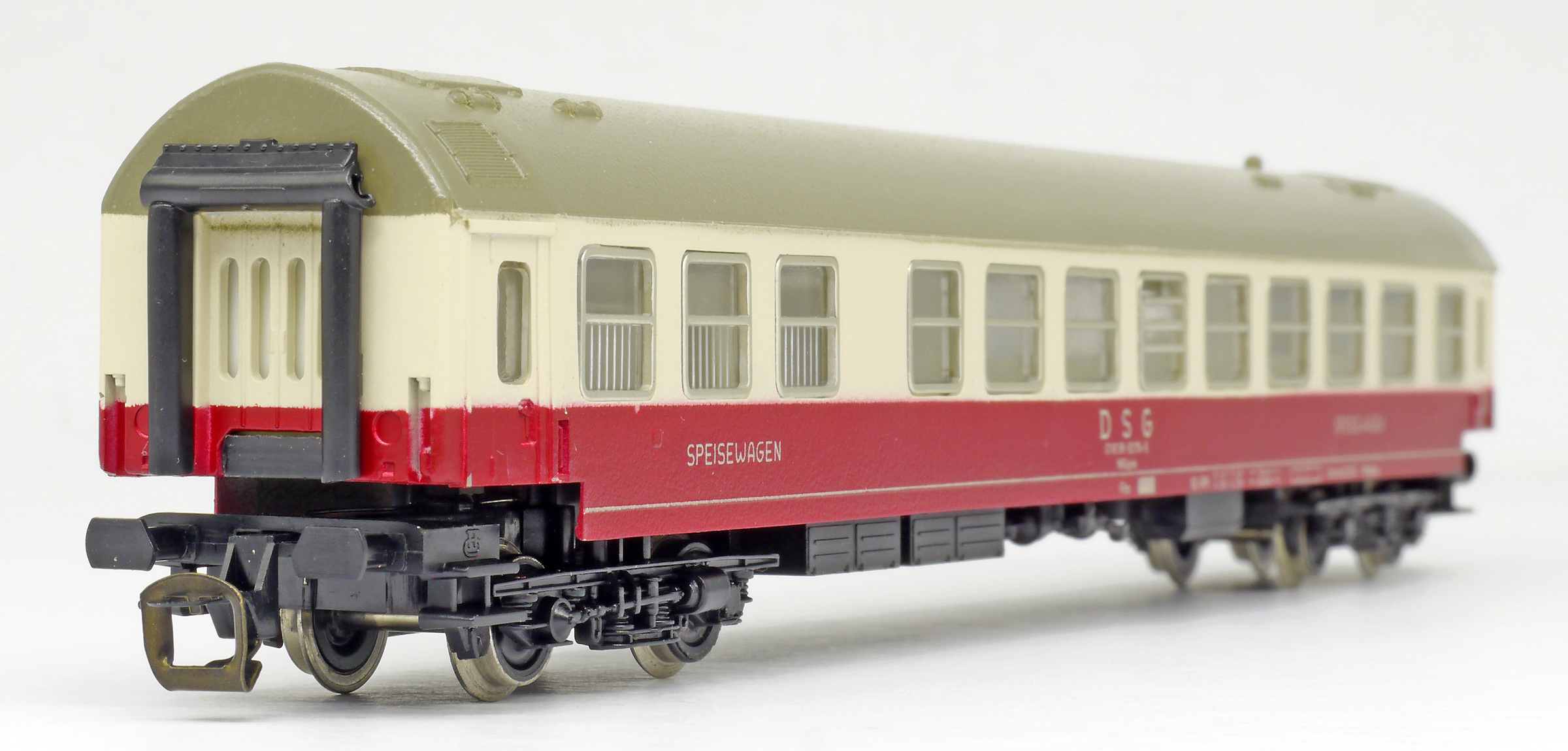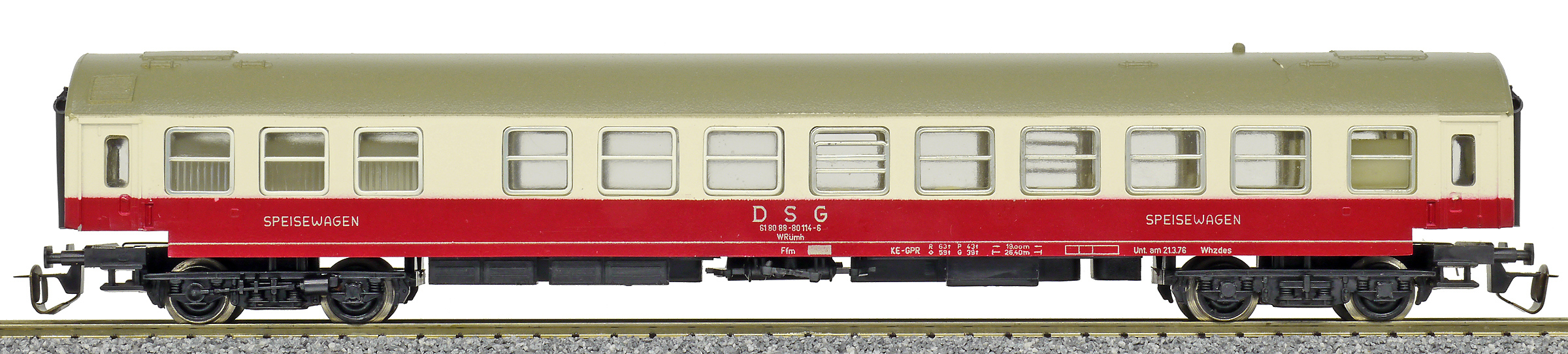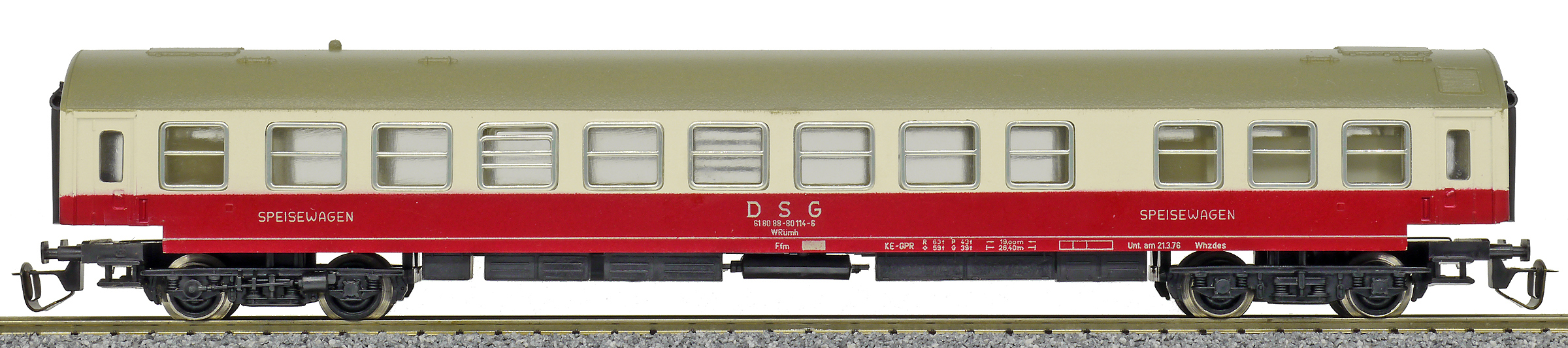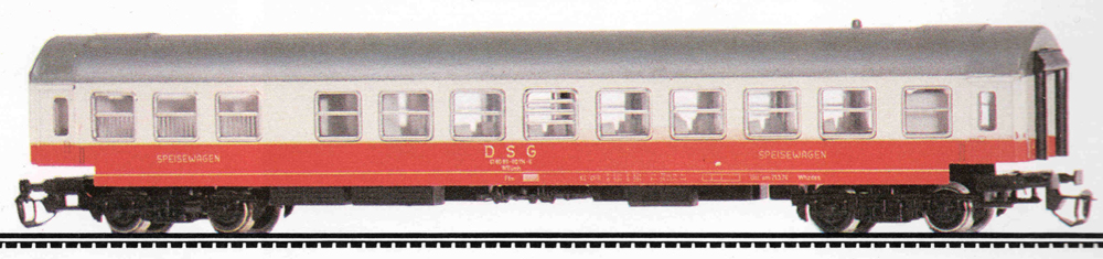| jídelní vůz červený-slonová kost s šedou střechou |