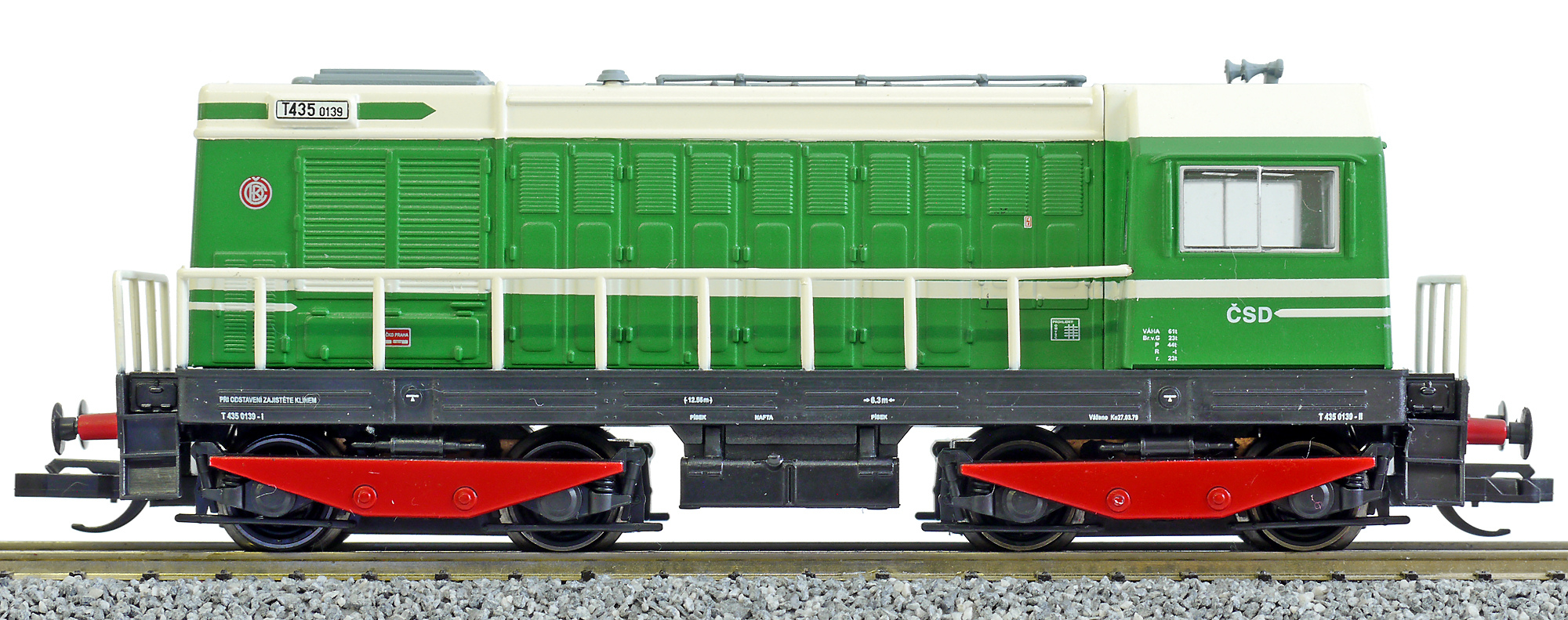 Popis   dieselová lokomotiva zelená-slonová kost, černý rám a bílé zábradlí