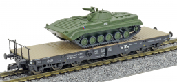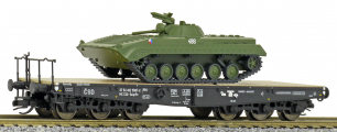 | plošinový nákladní vůz černý s nákladem tanku BMP-1 |