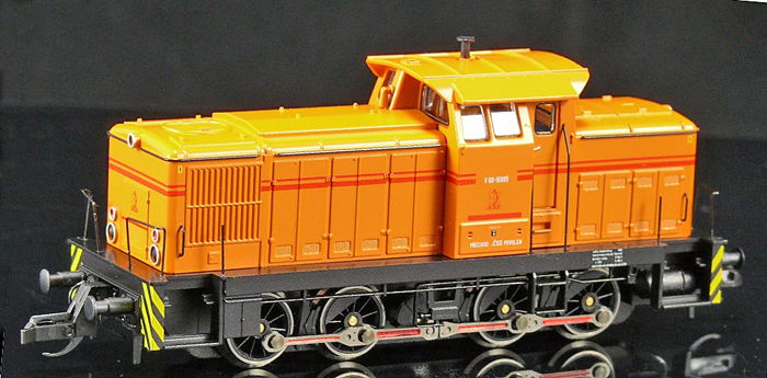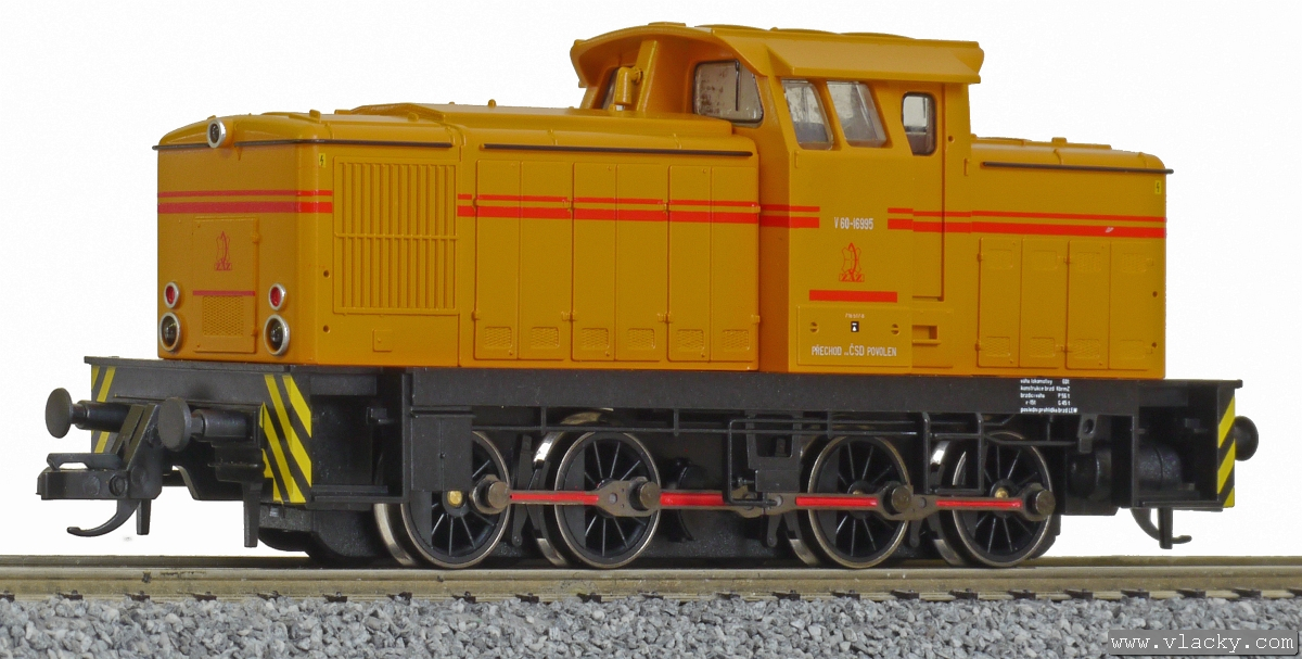 | dieselová lokomotiva oranžová s dvěma červenými proužky, černý rám |