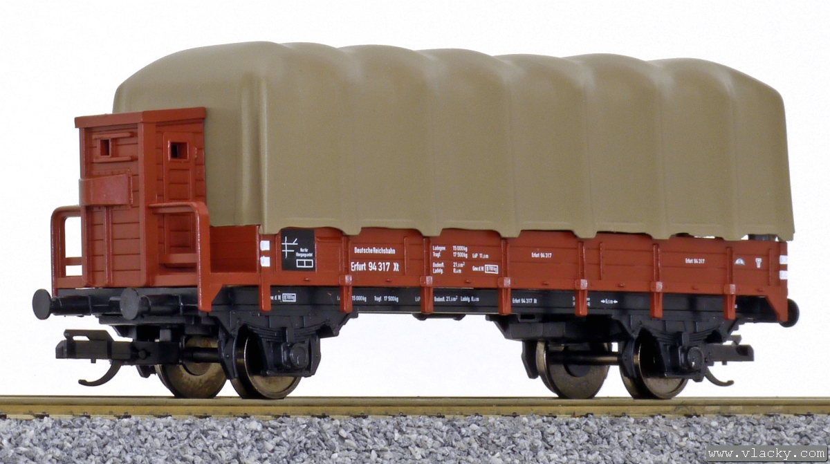 červenohnědý s brzdařskou budkou a tmavě šedou plachtou