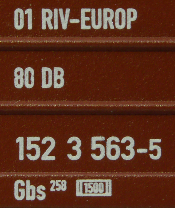 | • 01 80 152 3 563-5 | → | nákladní, nezávislé nápravy, pevný rozchod, ve vlastnictví železniční správy, RIV, EUROP/IF |