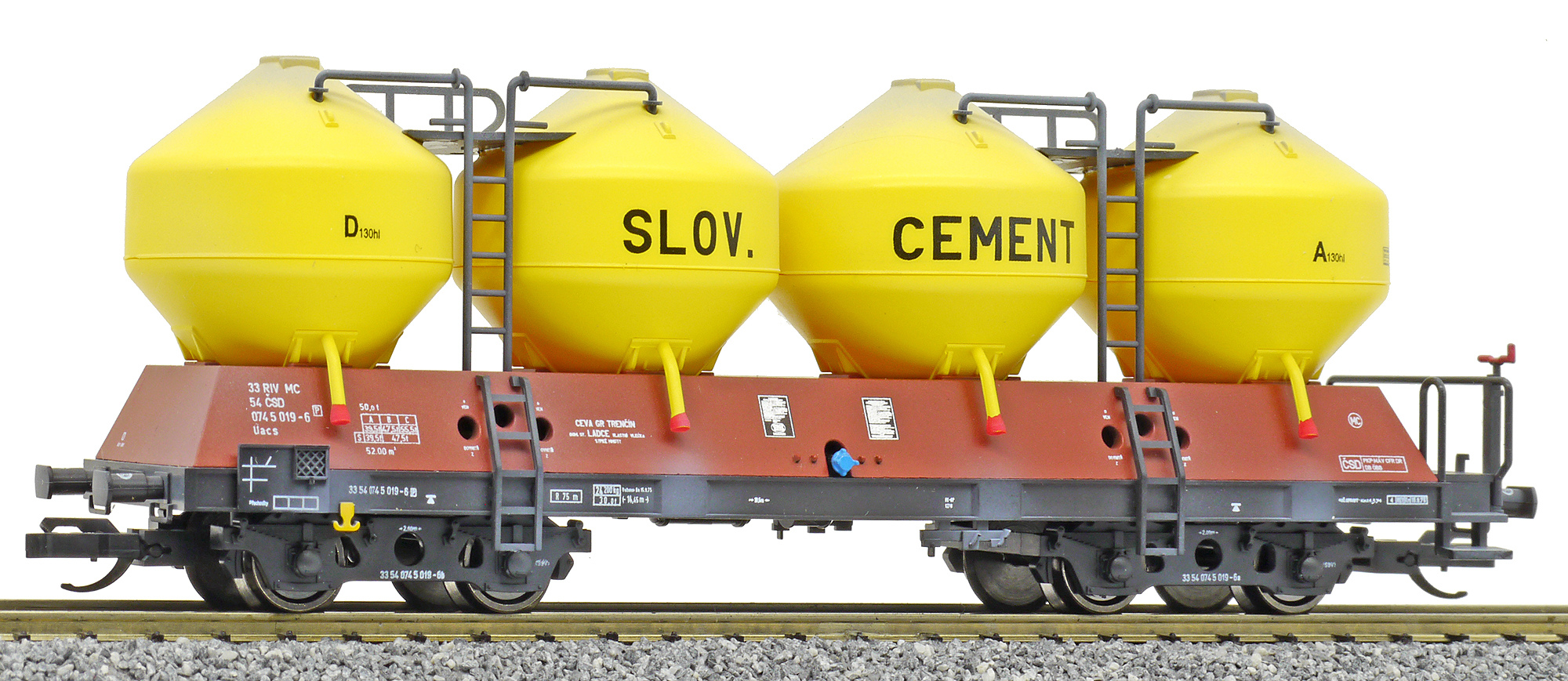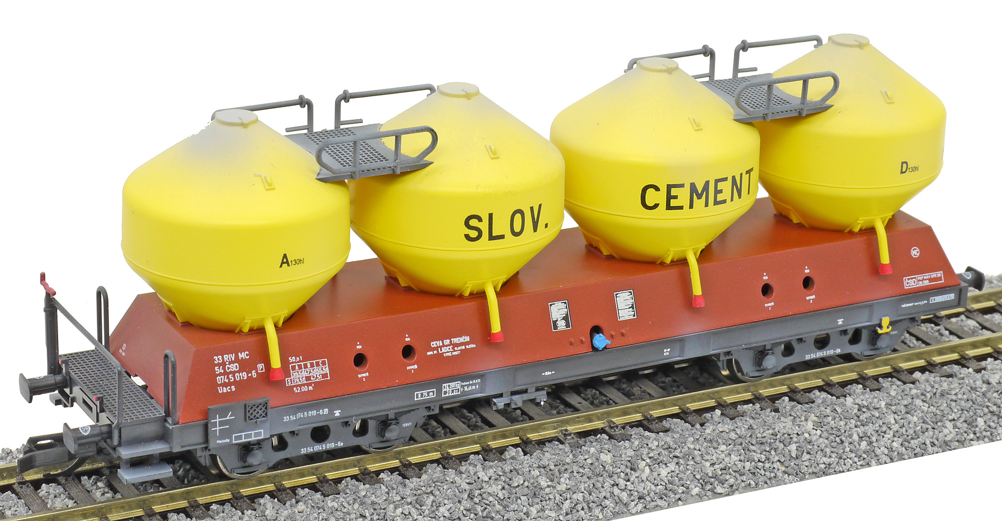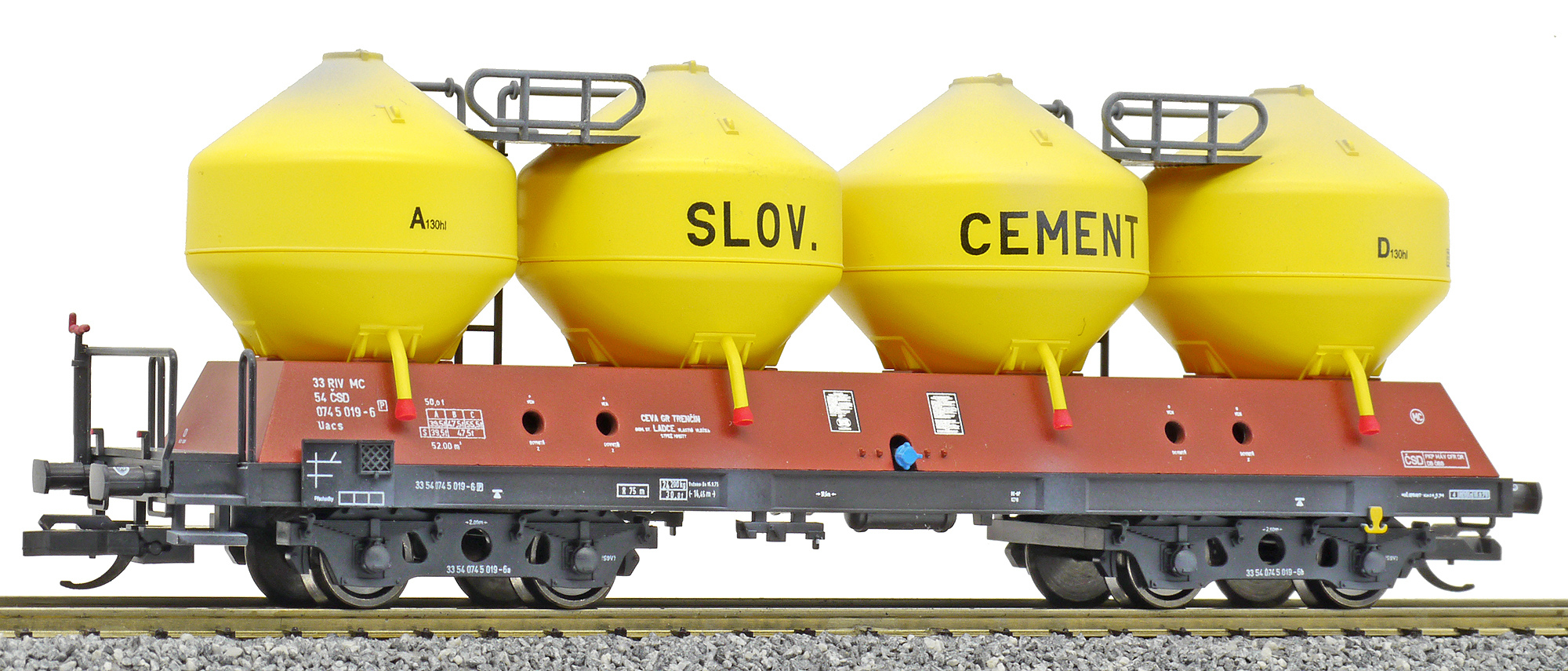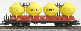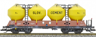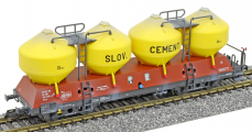 | nákladní samovýsypný vůz červenohnědý se žlutými nádobami „SLOV. CEMENT“ |
