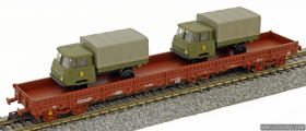 | nízkostěnný nákladní vůz červenohnědý s nákladem vojenských vozů „Militärtransport“ |