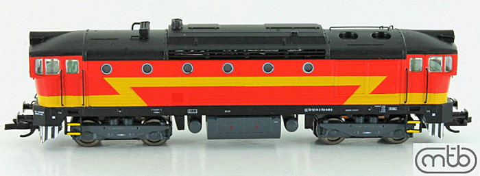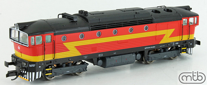 Popis   dieselová lokomotiva červená se žlutými blesky, tmavě šedá střecha, rám a pojezd