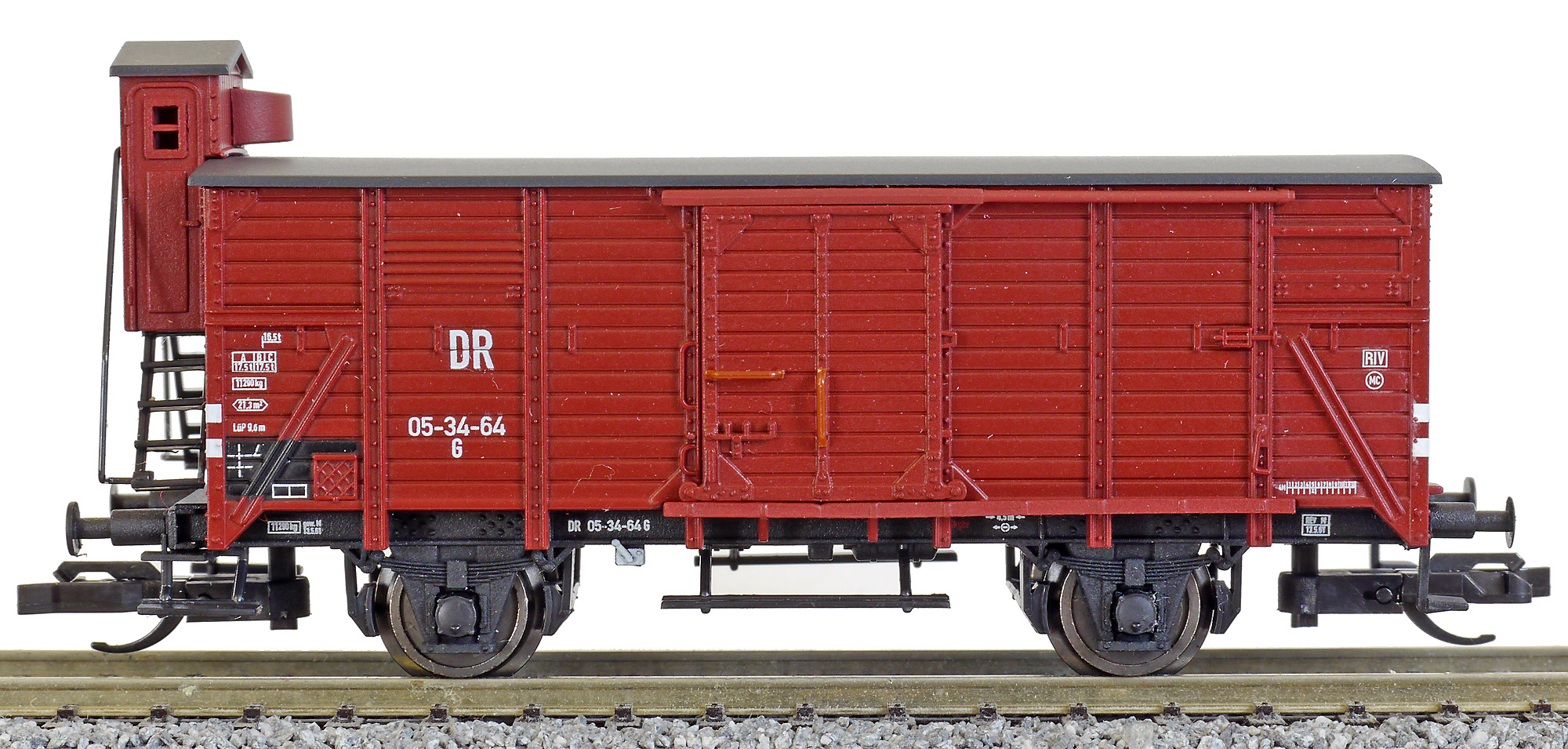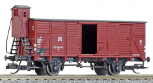 | krytý nákladní vůz červenohěndý s brzdařskou budkou |