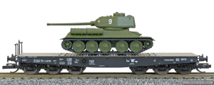Popis   plošinový nákladní vůz černý s nákladem tanku T34/85