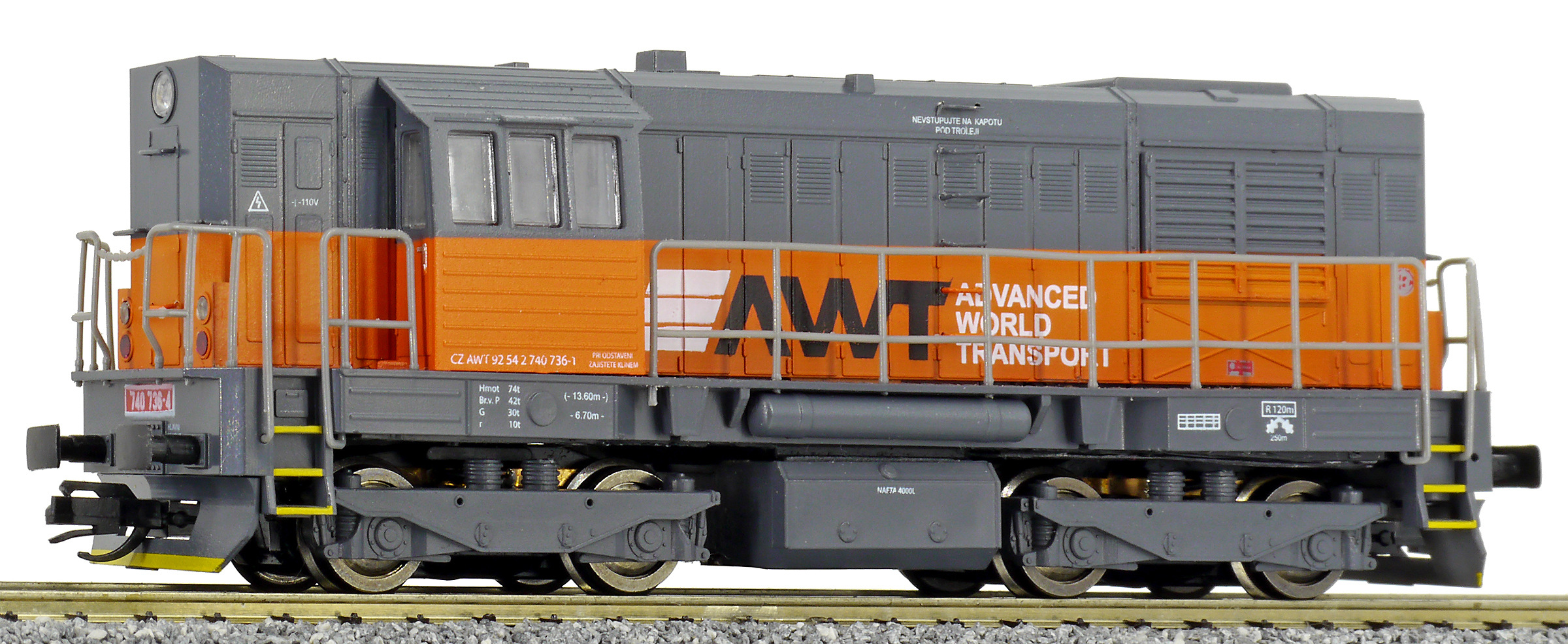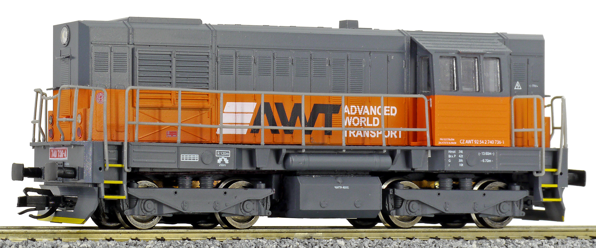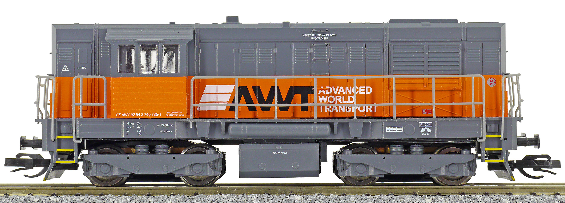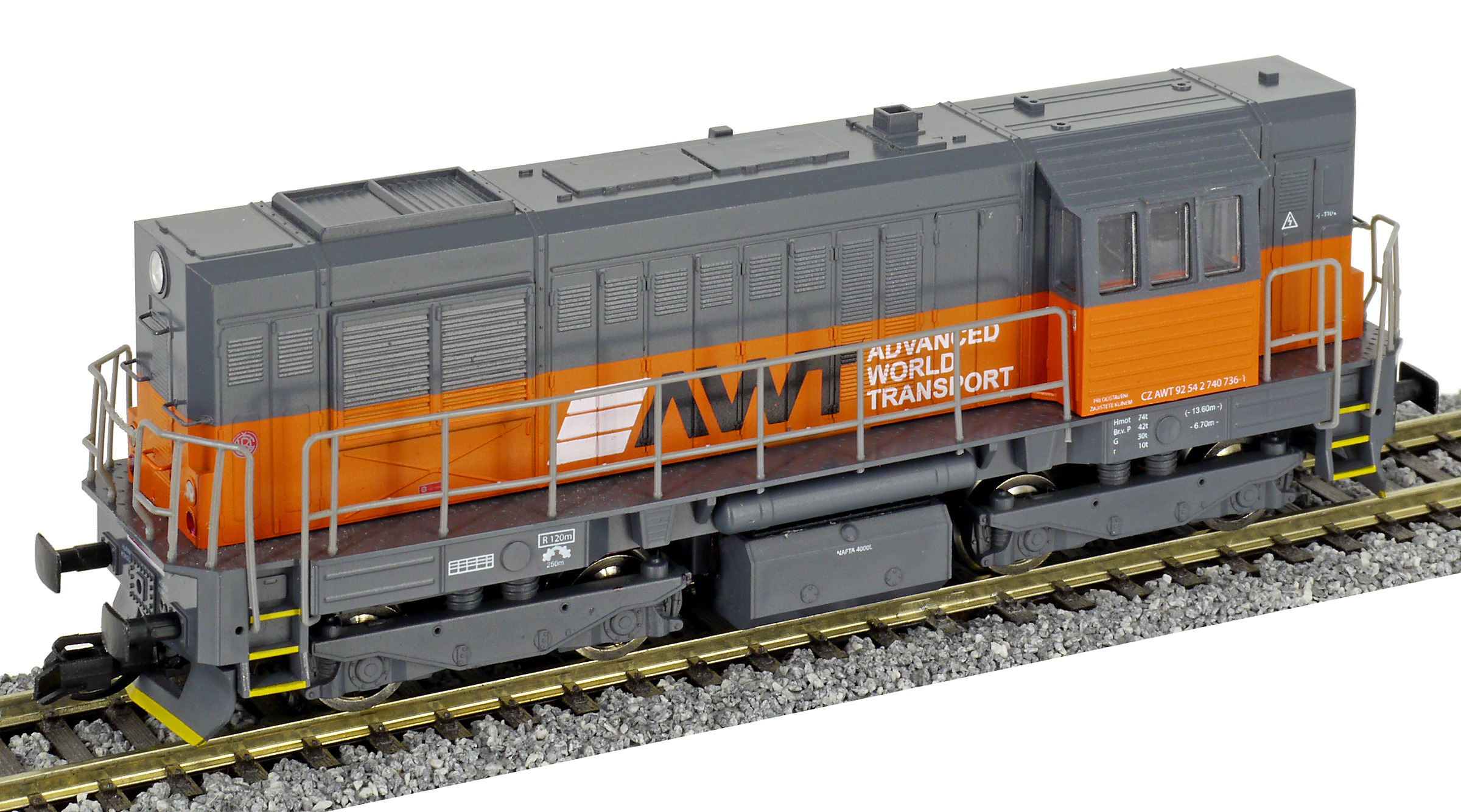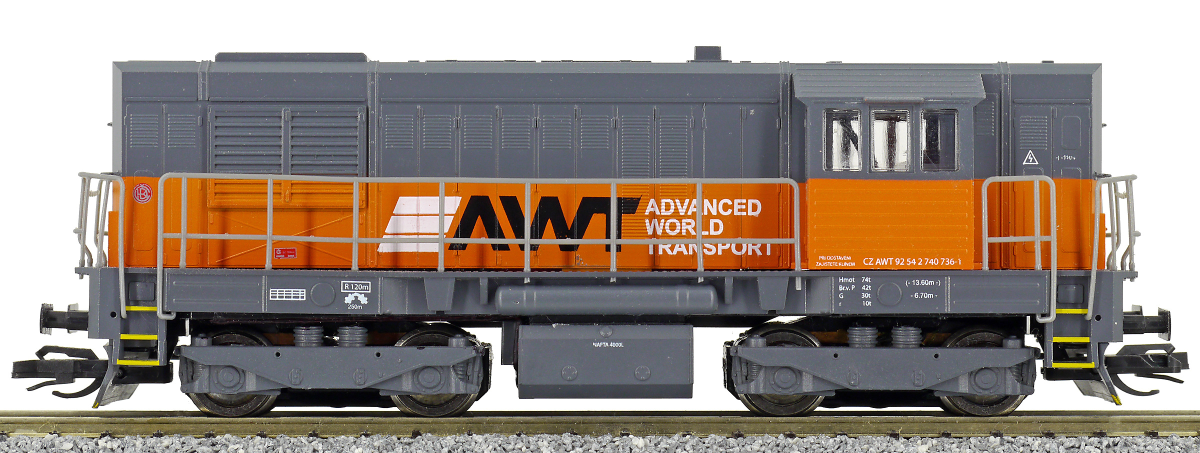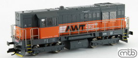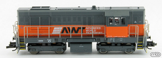 | dieselová lokomotiva tmavě šedá s oranžovým pásem „AWT“ |