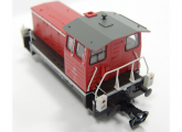 | dieselová lokomotiva červená s bílým lemováním, černý pojezd |