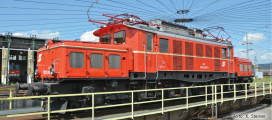 | elektrická lokomotiva červená s šedou střechou, černý rám a pojezd |