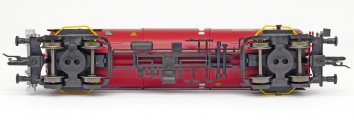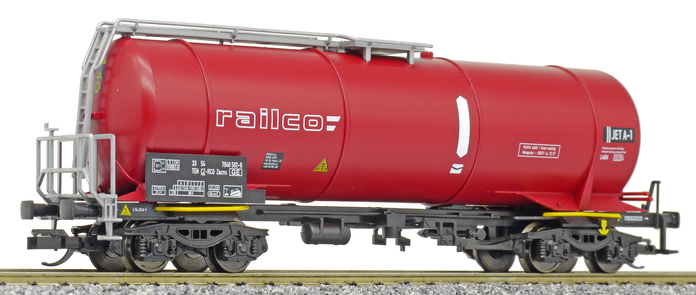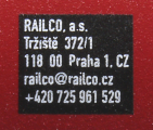 | kotlový vůz tmavě červený s bílými pásy a logem „railco“ |