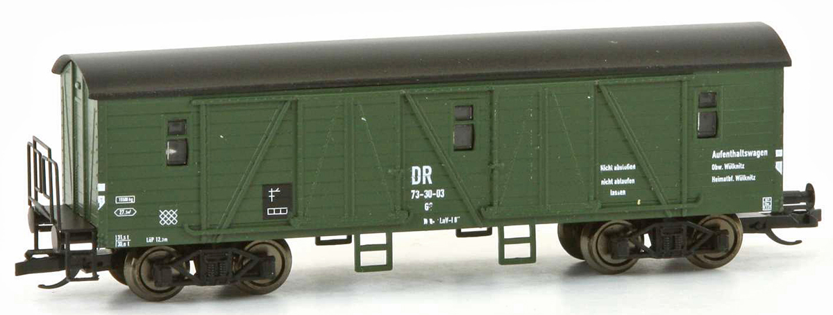 | krytý nákladní vůz do pracovního vlaku zelený s tmavě šedou střechou |