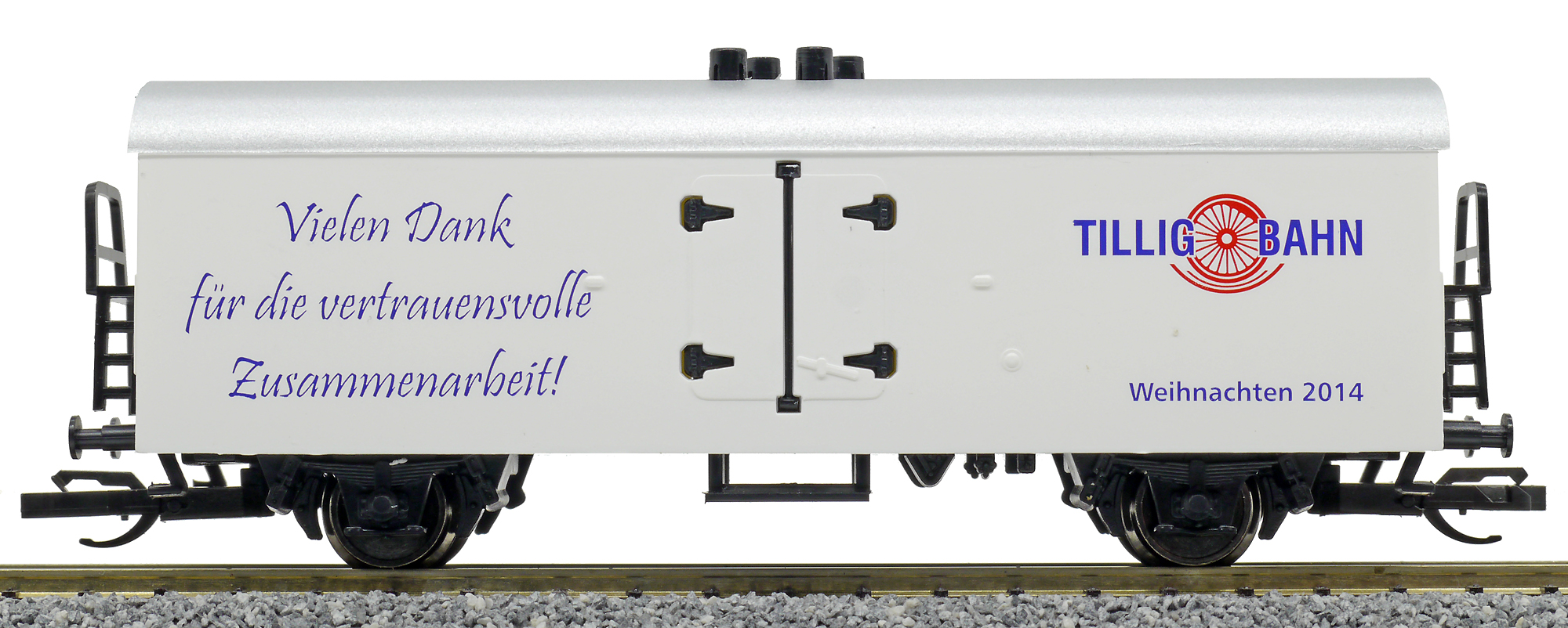| chladící vůz bílý se stříbrnou střechou a s reklamním potiskem „Weihnachten 2014“ |