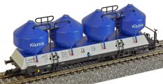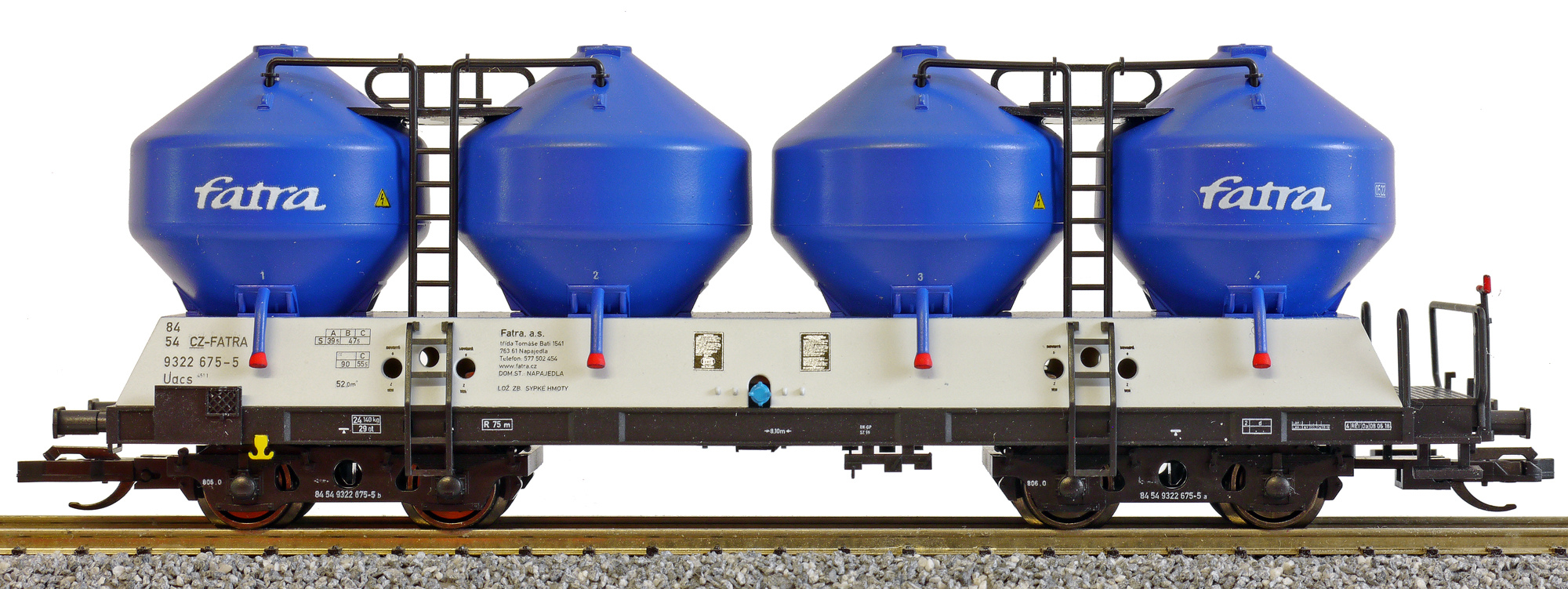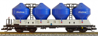 | nákladní samovýsypný vůz šedý-modrý s modrými nádobami a s logem „Fatra“ |