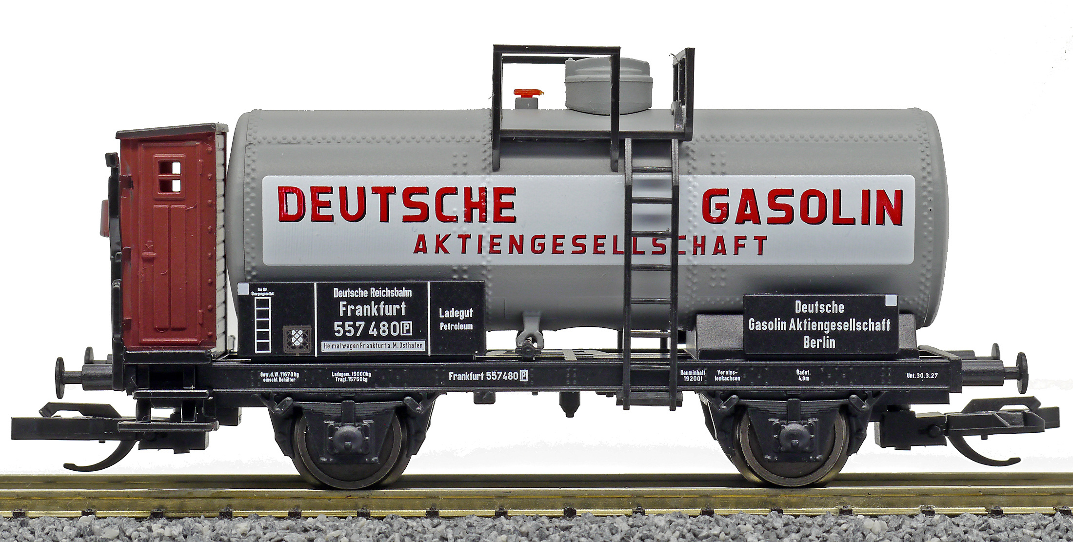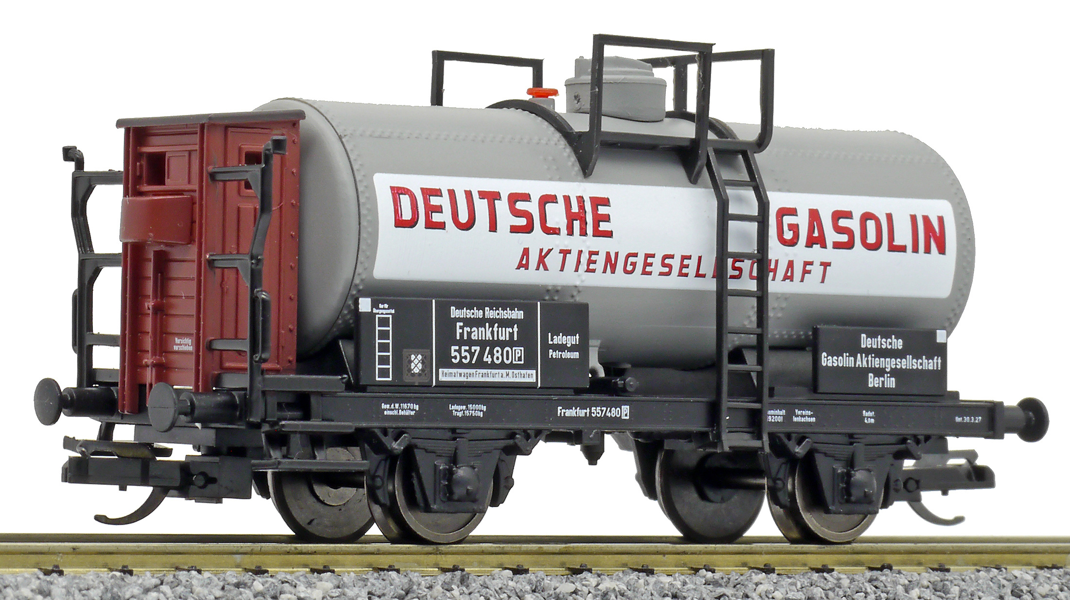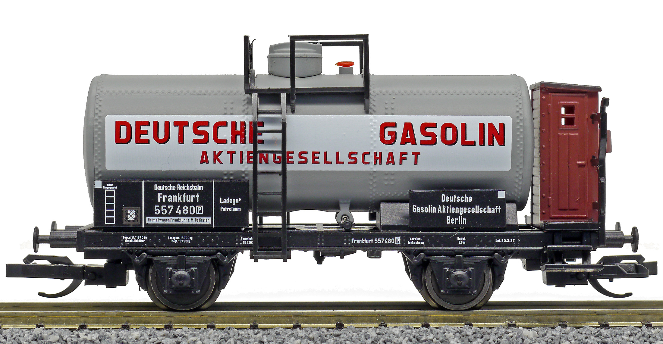 Popis   kotlový vůz šedý s brzdařskou budkou „Deutsche Gasolin AG“