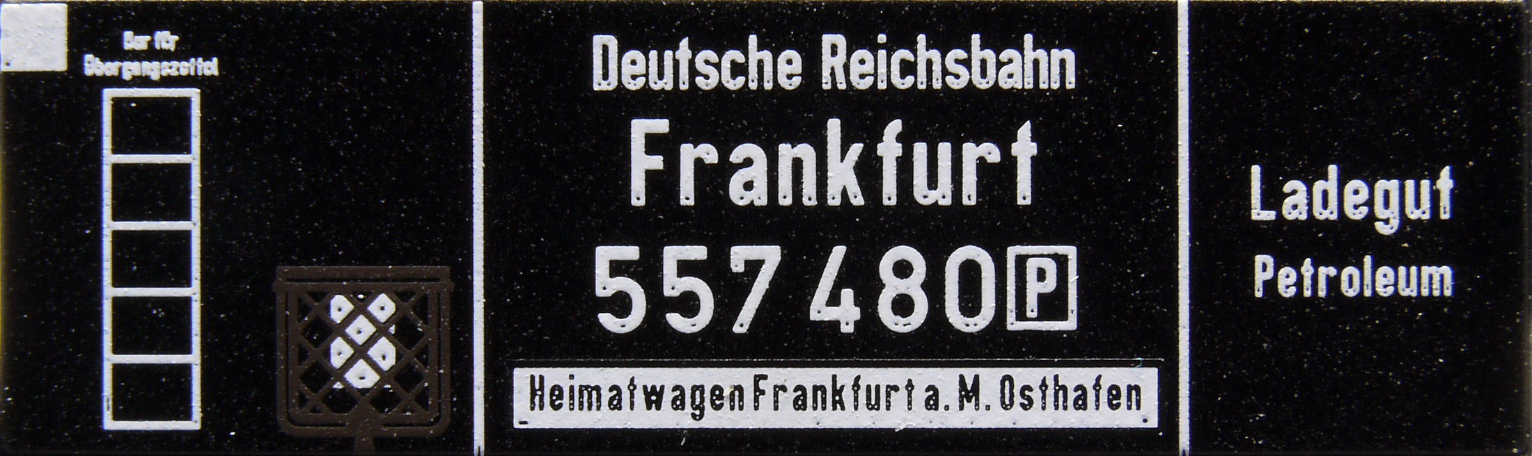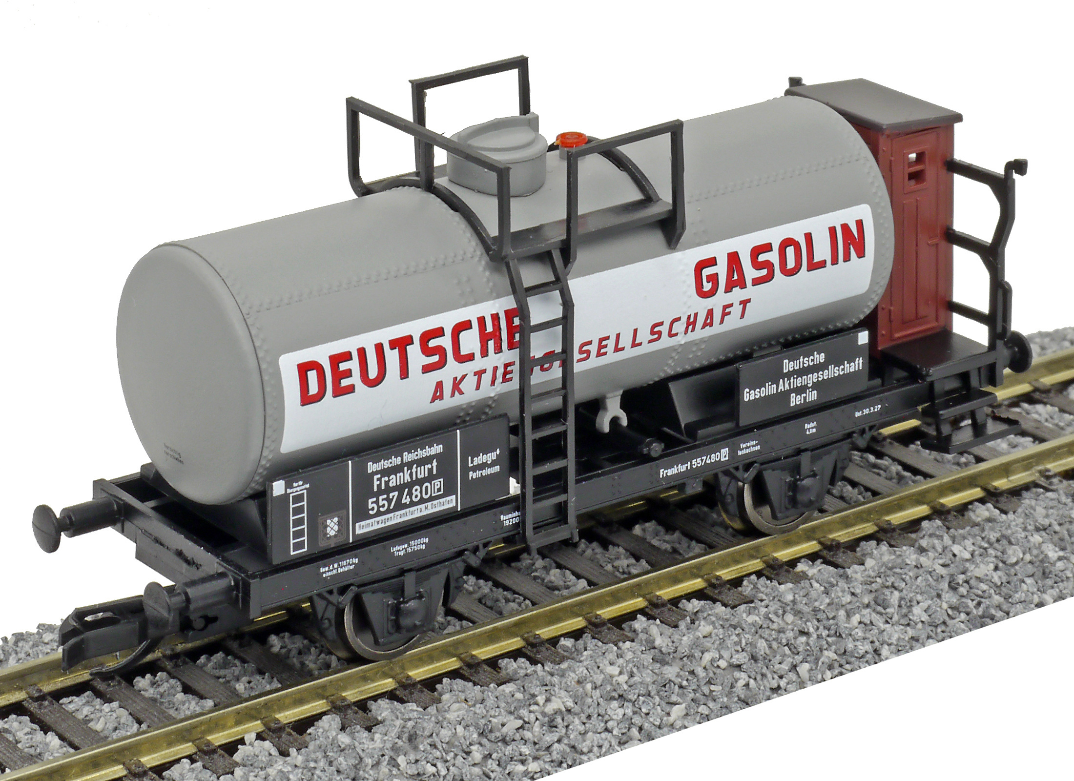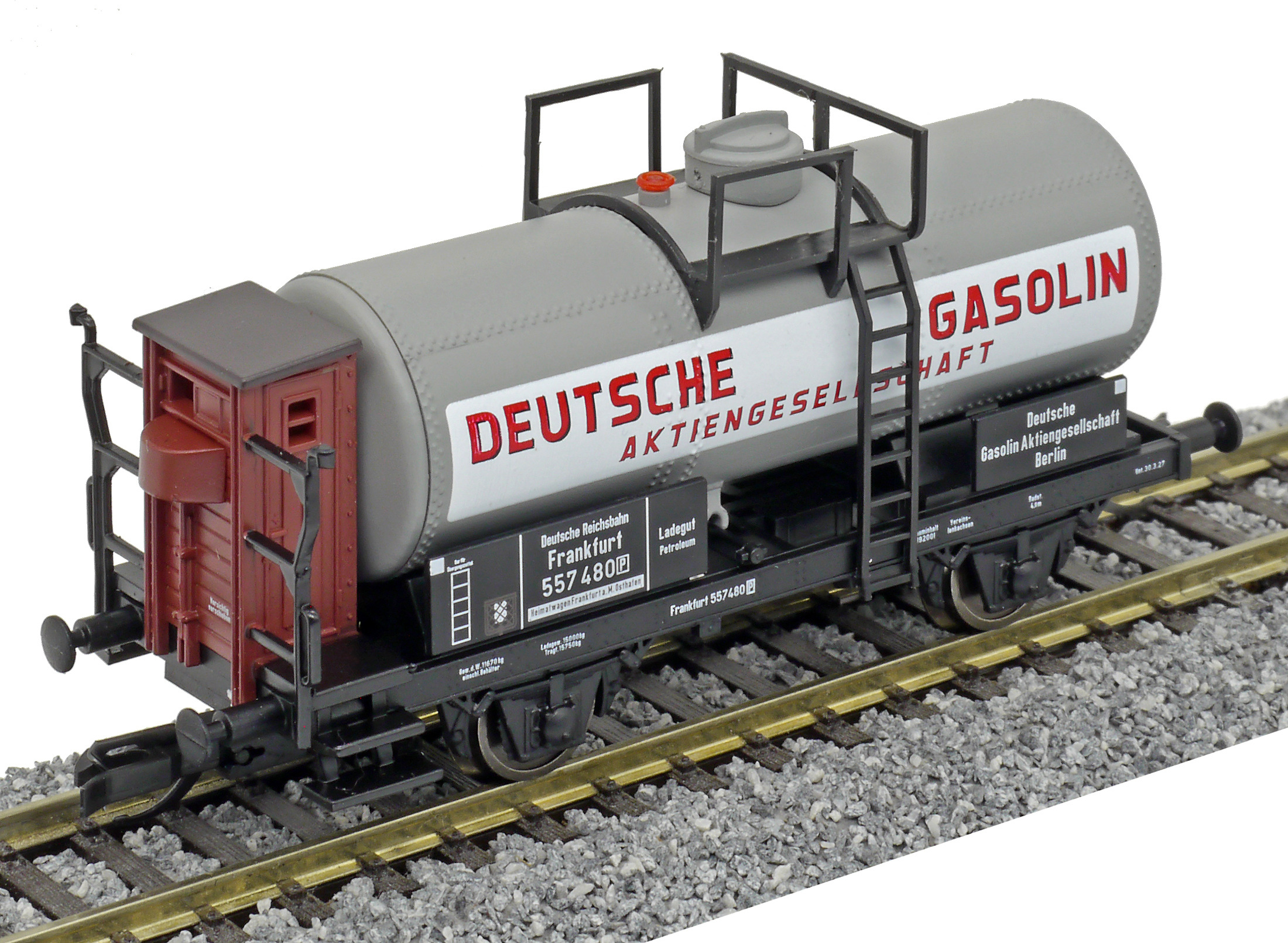 Popis   kotlový vůz šedý s brzdařskou budkou „Deutsche Gasolin AG“