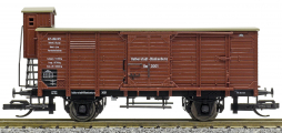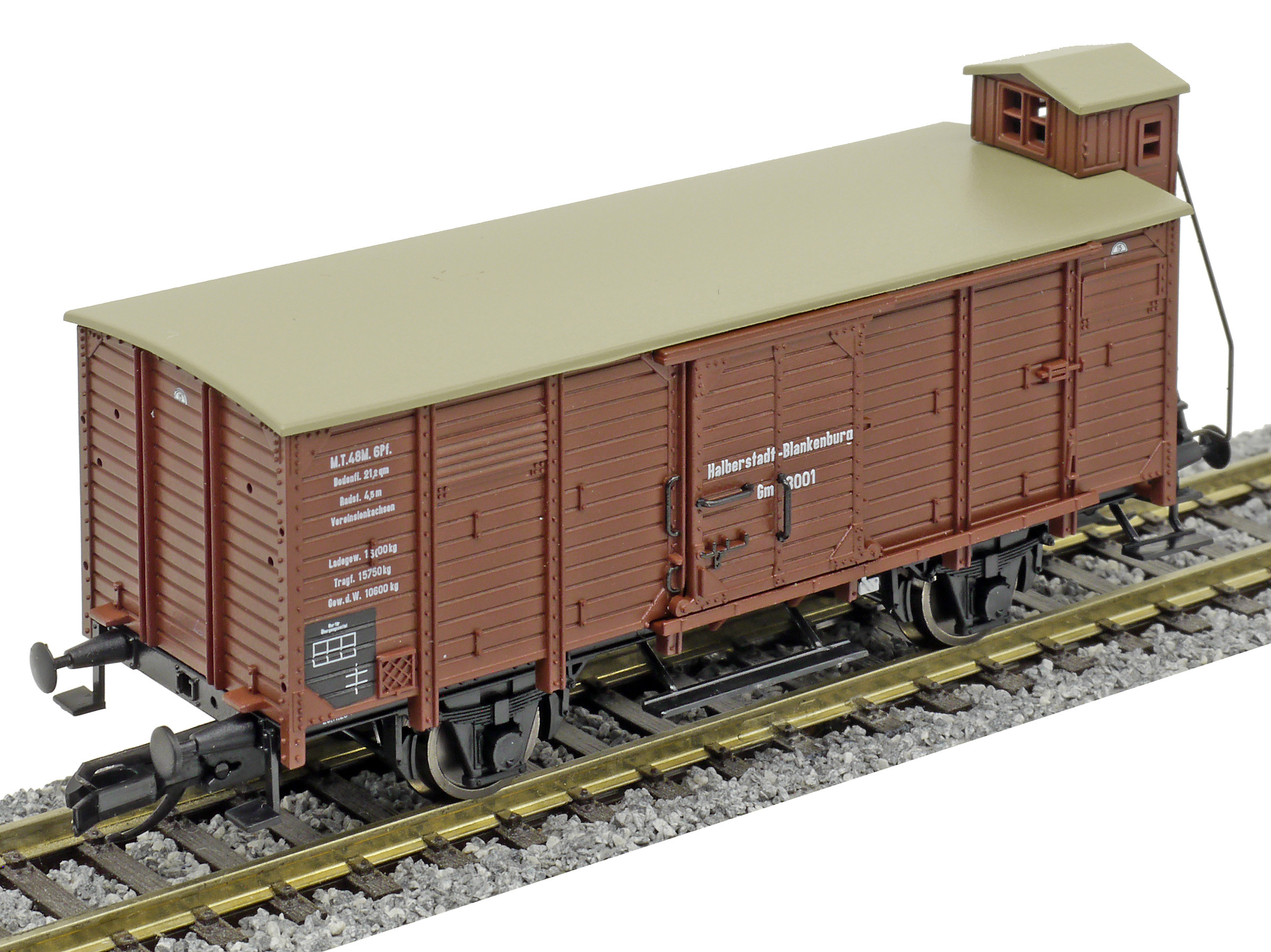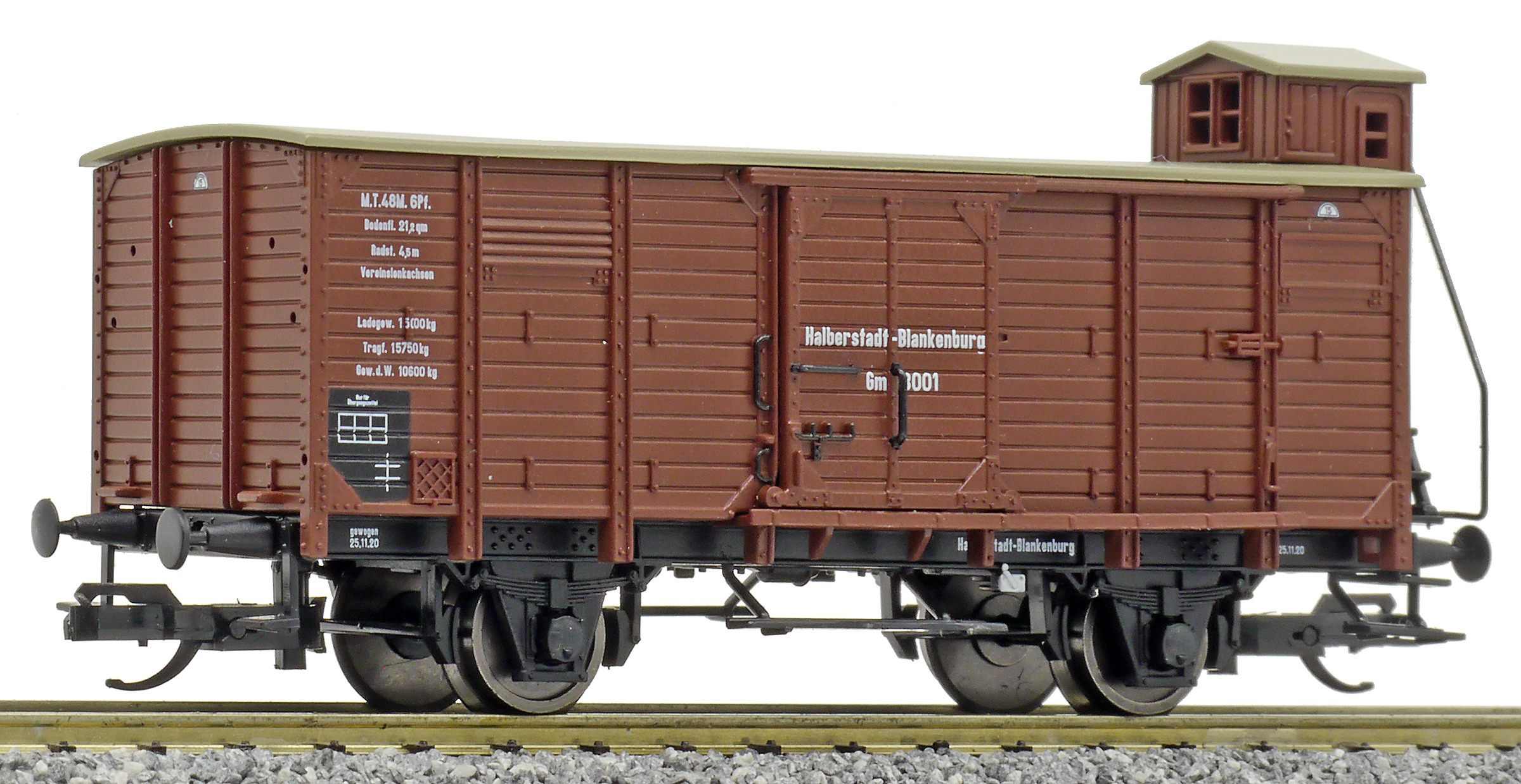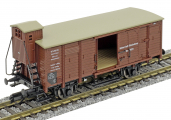 krytý nákladní vůz hnědý s černou střechou a s brzdařskou budkou