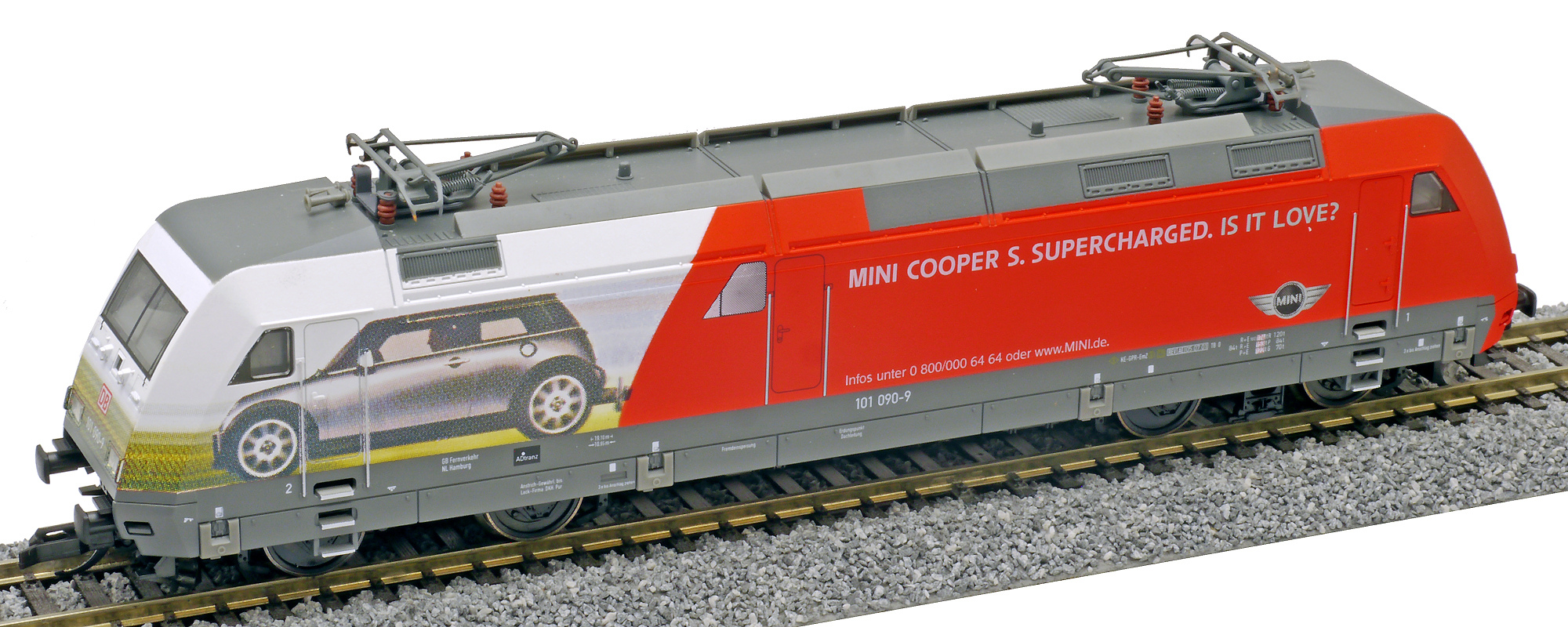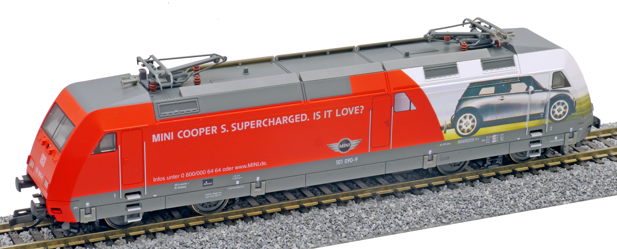 | elektrická lokomotiva s reklamním potiskem „Mini BMW“ |