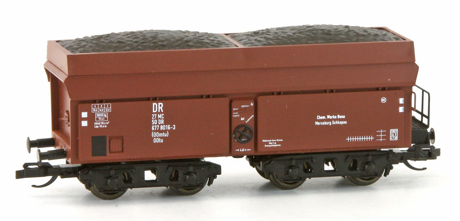 | nákladní samovýsypný vůz červenohnědý „Bunawerke“ s nákladem hnědého uhlí |