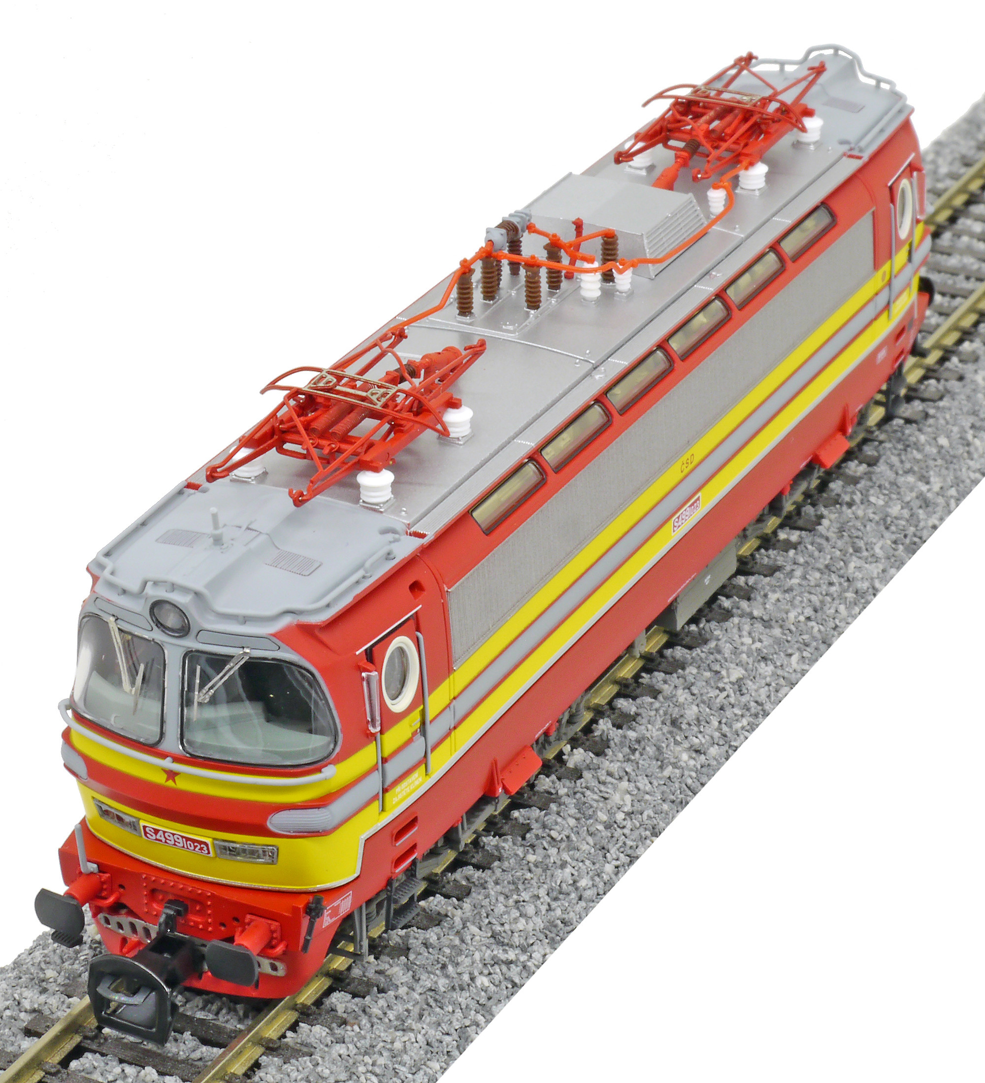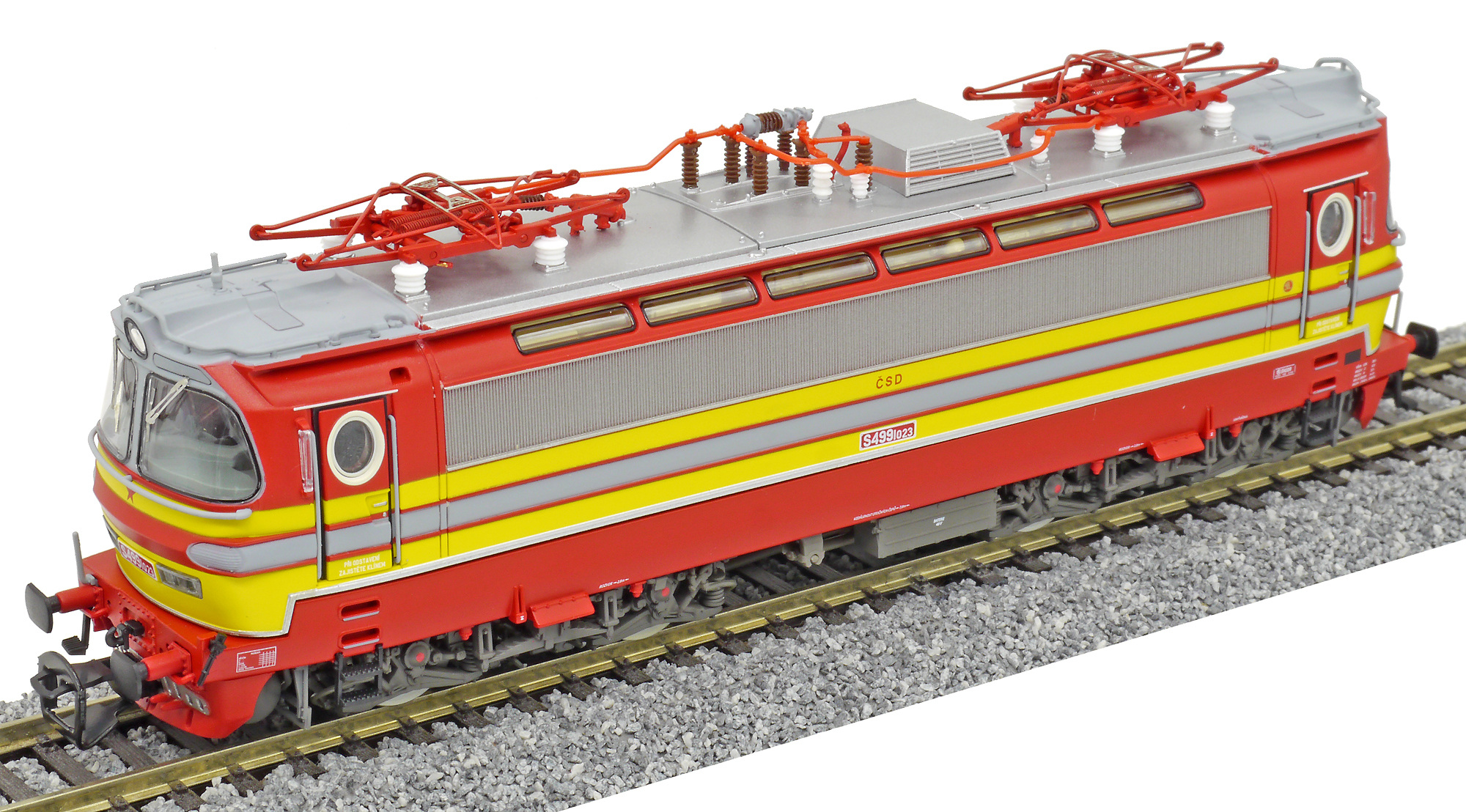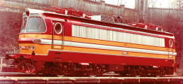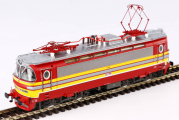 | elektrická lokomotiva v barevné kombinaci červená-žlutá, šedá střecha |