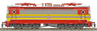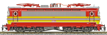 | elektrická lokomotiva v barevné kombinaci červená-žlutá, šedá střecha |
