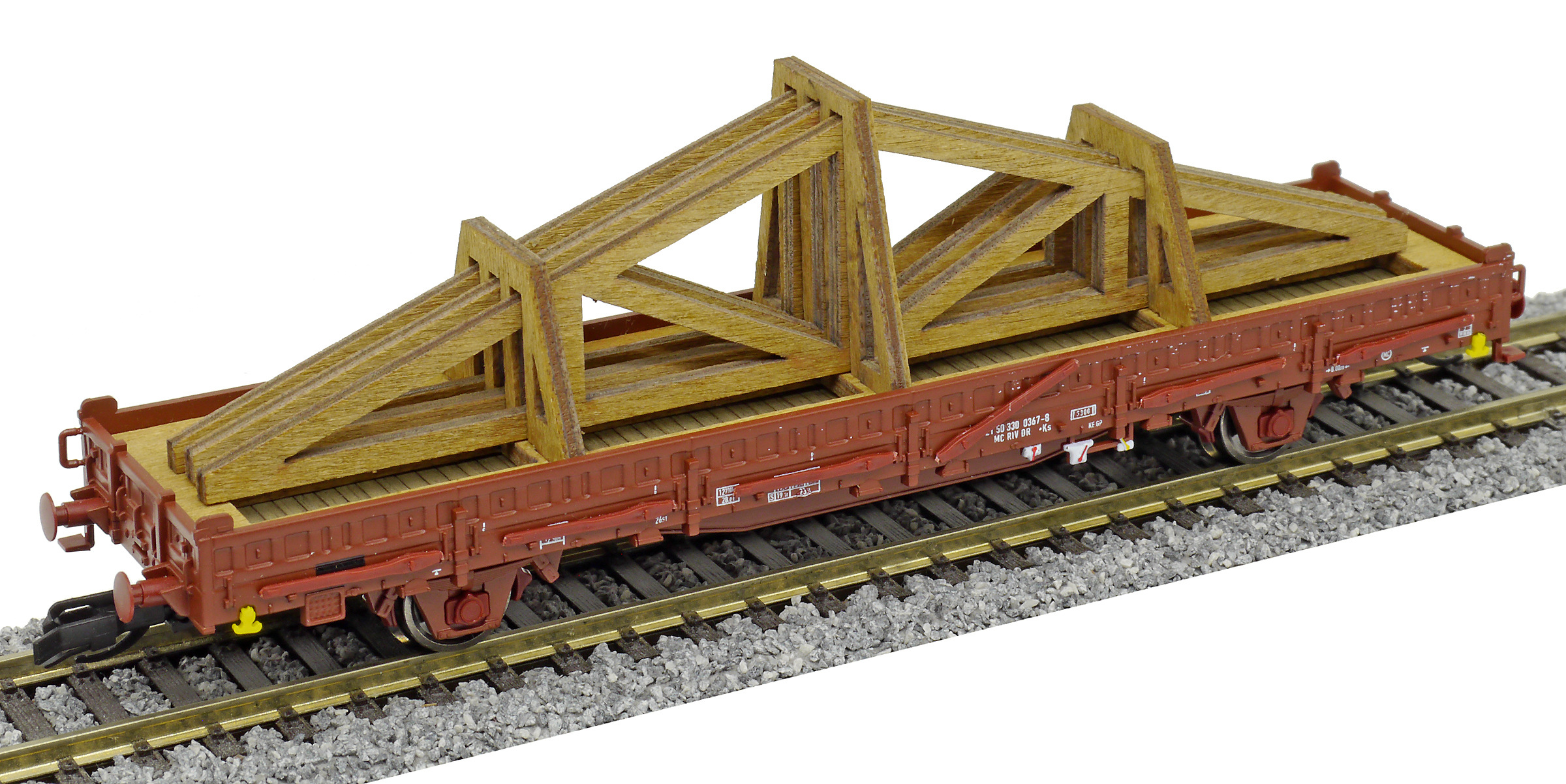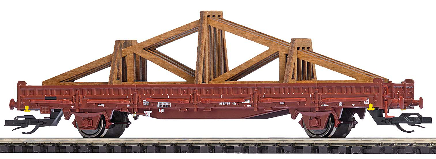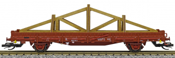 | nízkostěnný nákladní vůz červenohnědý s klanicemi s nákladem krovu střechy |