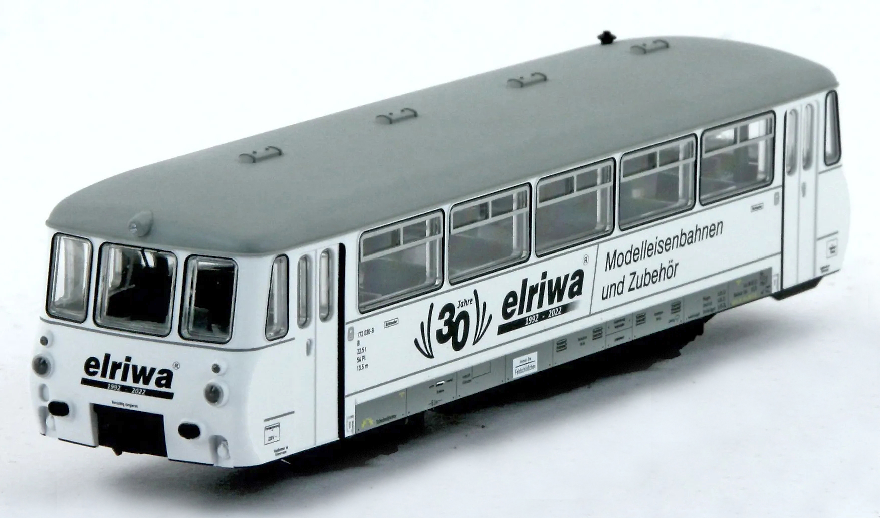 | motorový vůz bílý s reklamním potiskem „30 Jahre elriwa“ |